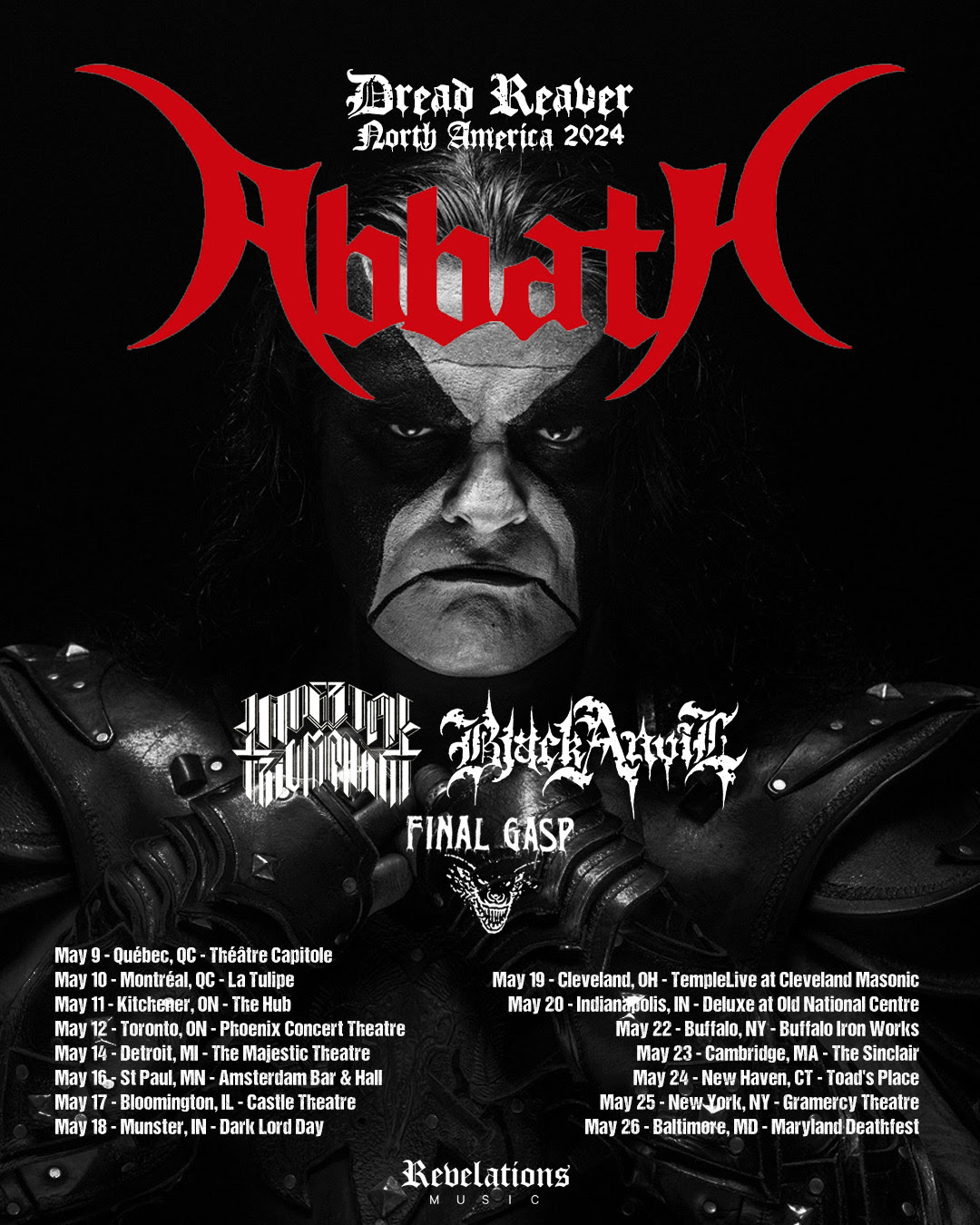 ABBATH, the eponymous project of one of black metal’s most iconic figures, will be hitting the road in North America starting tomorrow, May 9, in Quebec City, QC! Supported by BLACK ANVIL, IMPERIAL TRIUMPHANT, and FINAL GASP, the trek will make its way through the East Coast with stops at Maryland Death Fest in Baltimore, MD and Dark Lord Day in Munster, IN. The full itinerary can be found below!