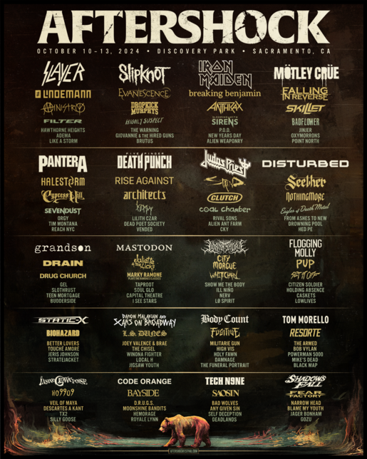 The lineup for Aftershock is as follows (subject to change): Iron Maiden, Slayer, Mötley Crüe, Slipknot, Disturbed, Pantera, Judas Priest, Five Finger Death Punch, Evanescence, Breaking Benjamin, Till Lindemann, Falling in Reverse, Rise Against, Staind, Halestorm, Seether, Dropkick Murphys, Flogging Molly, Mastodon, Anthrax, Architects, Tom Morello, Cypress Hill, Ministry, Daron Malakian and Scars on Broadway, Skillet, Sevendust, Tech N9ne, Insane Clown Posse, Static X, Clutch, Body Count, Lorna Shore, Highly Suspect, Poppy, Grandson, Nothing More, P.O.D., Filter, Eagles of Death Metal, Coal Chamber, Code Orange, Jinjer, Bad Wolves, Shadows Fall, Fear Factory, Sleeping With Sirens, Juliette Lewis and the Licks, Marky Ramone Plays The Ramones Classics, Drain, City Morgue, Saosin, L.S. Dunes, Badflower, PUP, Rival Sons, Militarie Gun, Hawthorne Heights, Bayside, Giovannie and the Hired Guns, Show Me The Body, Whitechapel, From Ashes to New, The Warning, Set it Off, Resorte, Fugitive, Better Lovers, Drug Church, Biohazard, Joey Valence & Brae, Tim Montana, Vended, The Chisel, The Armed, Soul Glo, High Vis, Narrow Head, I See Stars, Bob Vylan, GEL, Holding Absence, Touché Amoré, Citizen Soldier, New Years Day, Drowning Pool, Alien Ant Farm, Orgy, Adema, Powerman 5000, Taproot, Local H, HED PE, Moonshine Bandits, CKY, Brutus, Alien Weaponry, Oxymorrons, Veil of Maya, Lilith Czar, Holy Fawn, D.R.U.G.S., Ho99o9, Ill Niño, Winona Fighter, Slothrust, Hemorage, Nerv, Damnage, Jeris Johnson, Any Given Sin, Deadlands, Mike’s Dead, Self Deception, Lø Spirit, Jager Bonham, Dead Poet Society, Point North, Like A Storm, Teen Mortgage, Jigsaw Youth, The Funeral Portrait, Black Map, Capital Theatre, Descartes A Kant, Lowlives, StrateJacket, Blame My Youth, Caskets, Silly Goose, Reach NYC, TX2, Royale Lynn, Budderside, and Gozu.