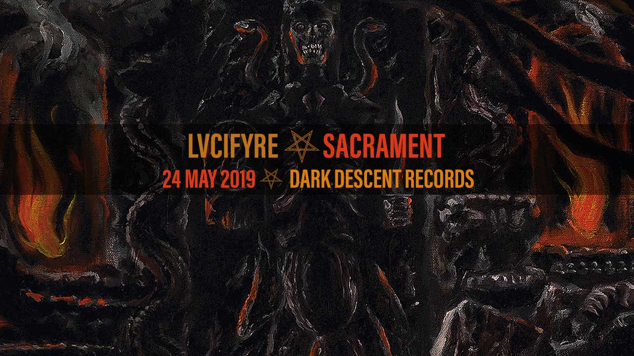 Enter Lvcifyre. Formed in 2007, the current two-piece hail from the gloom of London’s foggy streets. There could hardly be any location to better feed the frenzy of rabid creators of the darkest of Death Metal. Another London-based band worth mentioning is Akercocke for their vibe is quite similar despite the chasm between the two band’s approaches to their art. Upon first hearing Lvcifyre’s new EP, Sacrament, released just yesterday via Dark Descent Records, I was immediately hit with that unmistakable feeling previously described. That this was a band that takes its ethos seriously, exuding primally-forged darkness was simply undeniable. This five-song EP should be included in any and every fan’s discography, at least those looking to do more than simply shout at the devil.