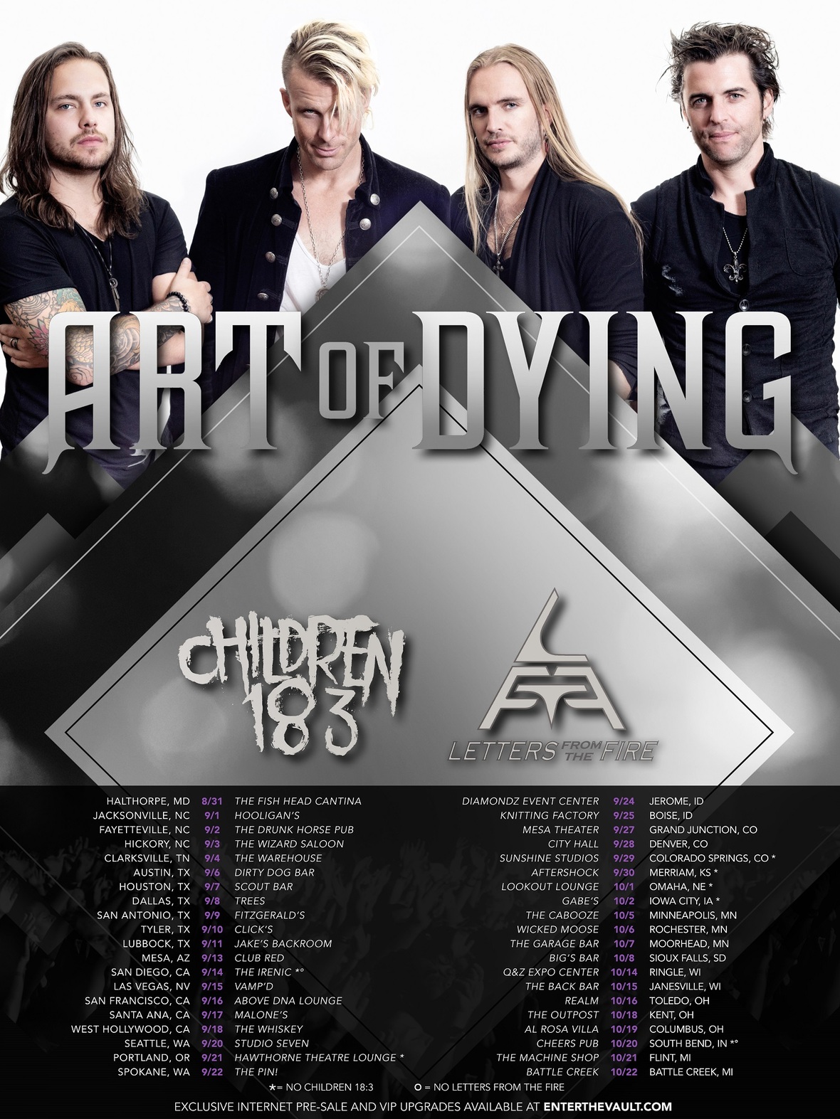 Vancouver, BC – Explosive Canadian rockers Art of Dying have announced the dates for their much anticipated US headlining tour, their first shows on American soil since releasing the critically acclaimed 13 song full length, Rise Up (Eleven Seven Music). Newcomers Children 18:3 and Letters From The Fire have been handpicked as support for the 40+ date run. Tickets and exclusive VIP upgrades are available now through EnterTheVault.com.
