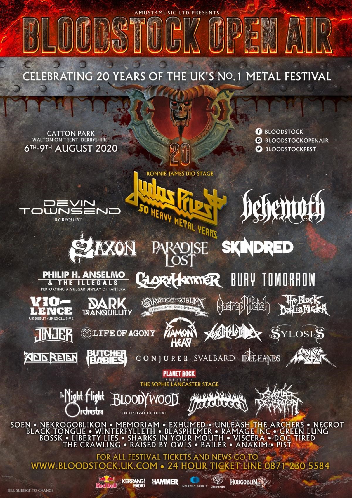 BLOODSTOCK’s 2020 main stage headliners are DEVIN TOWNSEND (Friday), BEHEMOTH (Saturday), and JUDAS PRIEST (Sunday). The festival also welcomes HATEBREED, PHILIP H. ANSELMO & THE ILLEGALS, SKINDRED, PARADISE LOST, LIFE OF AGONY, BURY TOMORROW, BLACK DAHLIA MURDER, DIAMOND HEAD, JINJER, VIO-LENCE, SACRED REICH, GLORYHAMMER, DARK TRANQUILLITY, BUTCHER BABIES, CATTLE DECAPITATION, BLOODYWOOD, MEMORIAM, RAMAGE INC, GREEN LUNG, BOSSK, CONJURER, ORANGE GOBLIN, THE NIGHT FLIGHT ORCHESTRA, UNLEASH THE ARCHERS, SAXON, SYLOSIS, TOXIC HOLOCAUST, NECTOR, WINTERFYLLETH, EXHUMED, NEKROGOBLIKON, THE CRAWLING, RAISED BY OWLS, ANAKIM, ACID REIGN, SVALBARD, IDLE HANDS, SOEN, VISCERA, DOG TIRED, & BAILER so far. Many more bands performing over the weekend are still to be announced! Unsure what to expect? Watch a trailer all about BLOODSTOCK here.