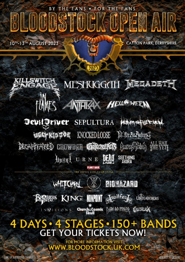 BLOODSTOCK’s 2023 Ronnie James Dio main stage headliners are rounded out by none other than KILLSWITCH ENGAGE and MEGADETH. Also appearing are IN FLAMES, DEVILDRIVER, ANTHRAX, BIOHAZARD, SACRED REICH, HEAVEN SHALL BURN, SEPULTURA, WHITECHAPEL, FIT FOR AN AUTOPSY, CROWBAR, SEETHING AKIRA, UGLY KID JOE, DECAPITATED, GATECREEPER, ZEAL & ARDOR, KING 810, UNTO OTHERS, URNE, ALL HAIL THE YETI, DEAD LABEL, NONPOINT, CHURCH OF THE COSMIC SKULL, BROTHERS OF METAL, GUTALAX, UUHAI, INVISIONS, COBRA THE IMPALER, and TROLLFEST. Many more are yet to be announced.