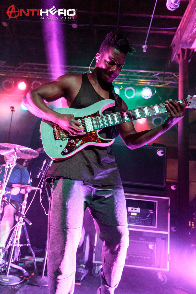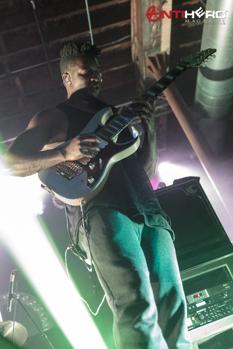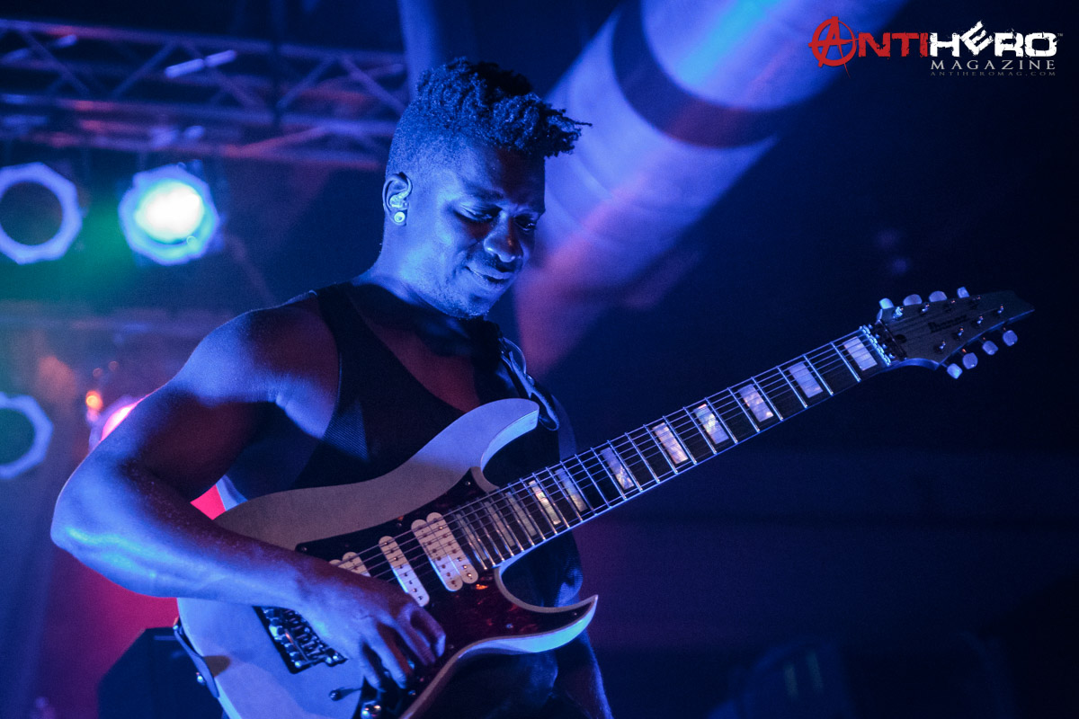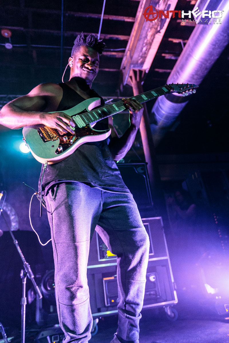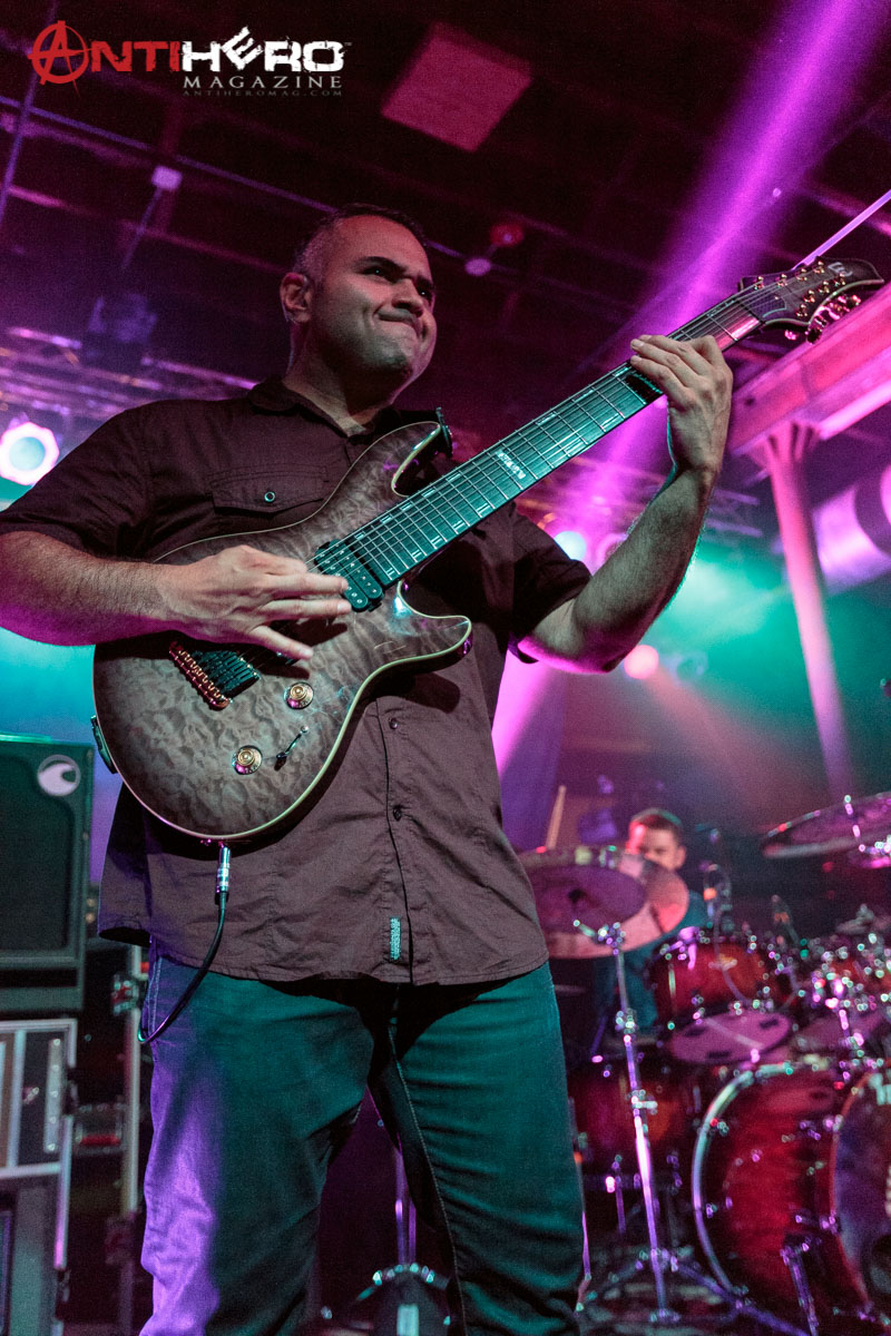 The instrumental progressive giants and titans of technical fretboard wizardry ANIMALS AS LEADERS – featuring guitarists Tosin Abasi and Javier Reyes, and drummer Matt Garstka – performed an electrifying set comprised mostly of tracks from their 2014 Sumerian Records release The Joy of Motion, ending with a dizzying delivery of CAFO from the 2009 self-titled debut album. The trio played at Wooly’s in downtown Des Moines, Iowa, supporting Between The Buried And Me, along with guests The Contortionist.