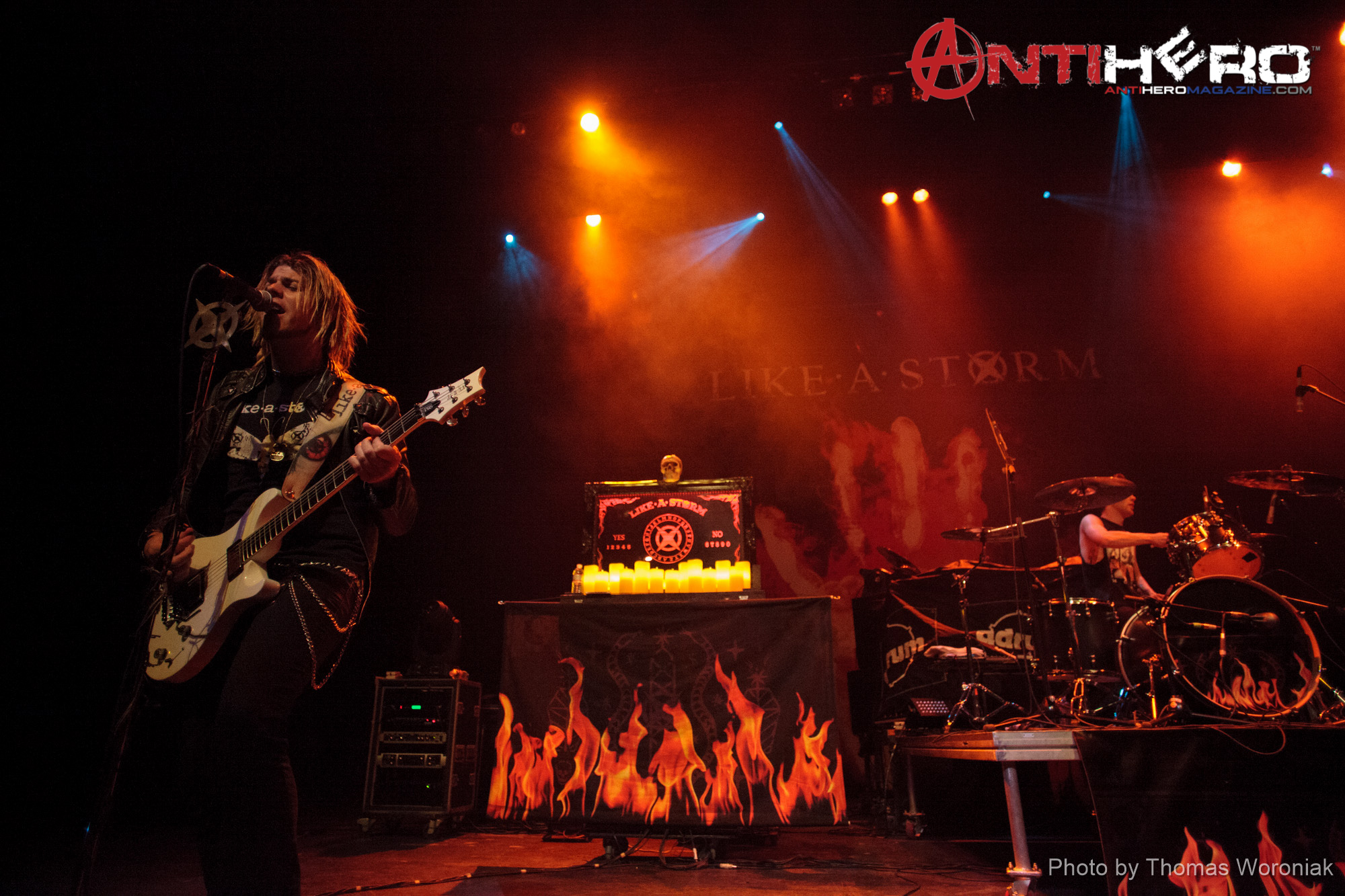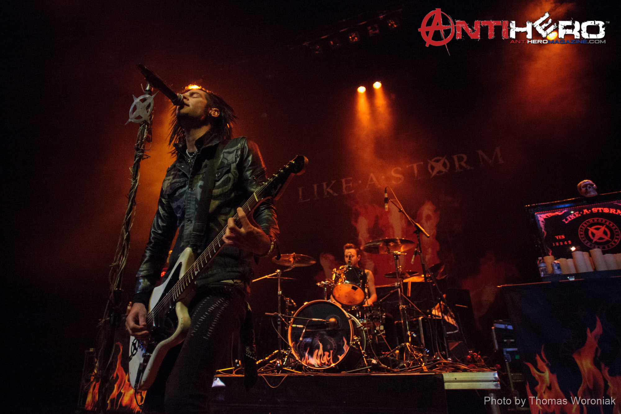 New Zealand rockers Like A Storm, featuring brothers Chris, Matt & Kent Brooks, kicked some Kansas City ass Tuesday night at the Arvest Bank Theater at the Midland. On tour supporting Hellyeah, the band delivered an energetic set including a couple of tunes where singer Chris Brooks played a didgeridoo, as well as a baritone acoustic guitar. Also on the bill this evening was Devour The Day, providing direct support for HellYeah. Photographer Thomas Woroniak was in the pit to grab these shots.