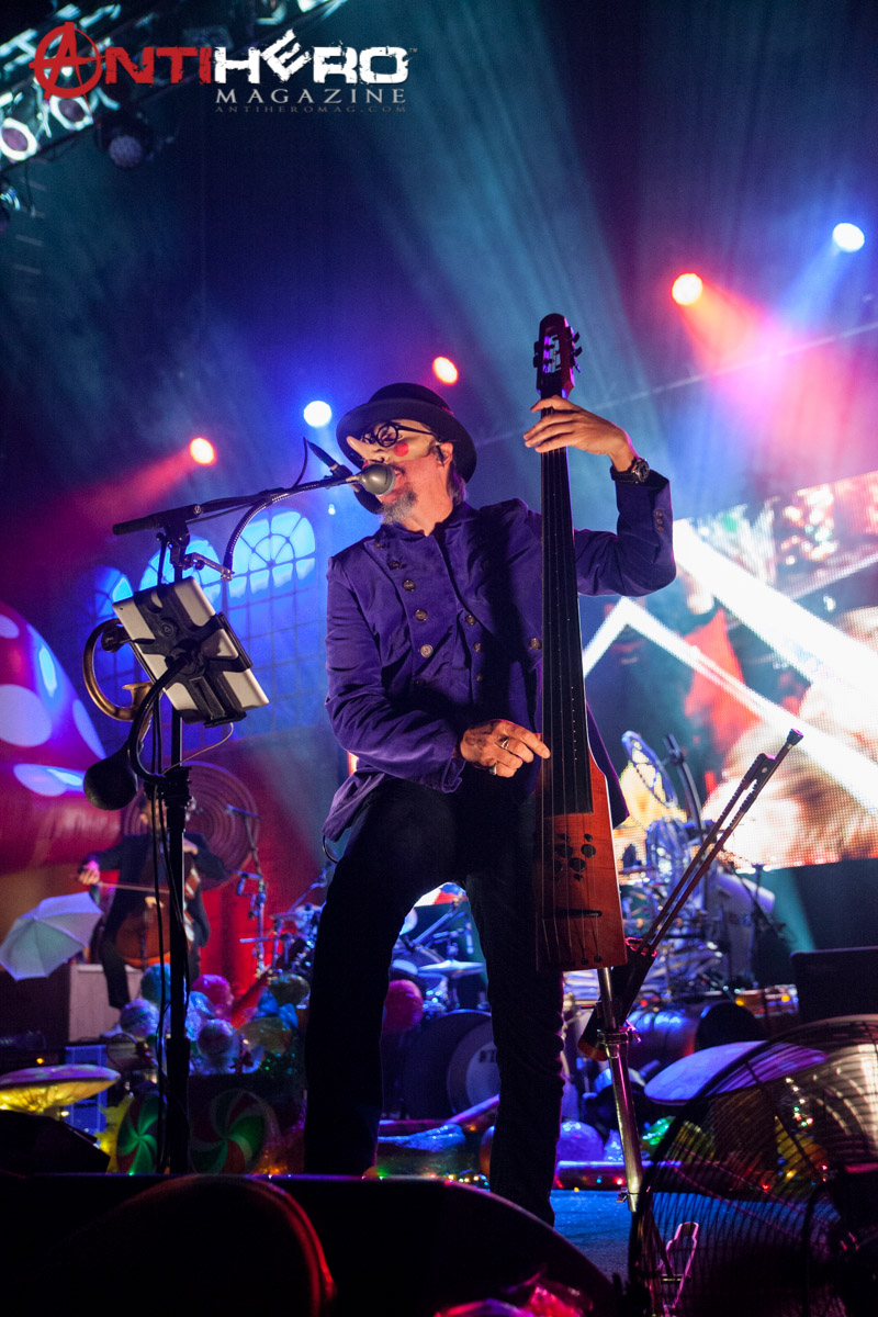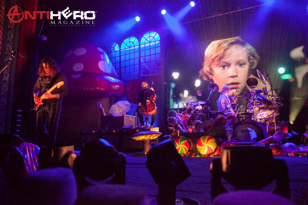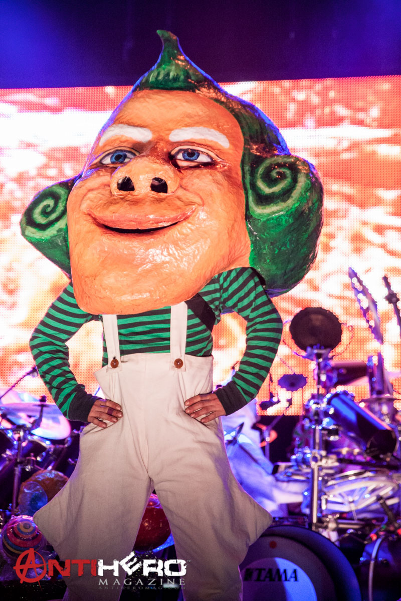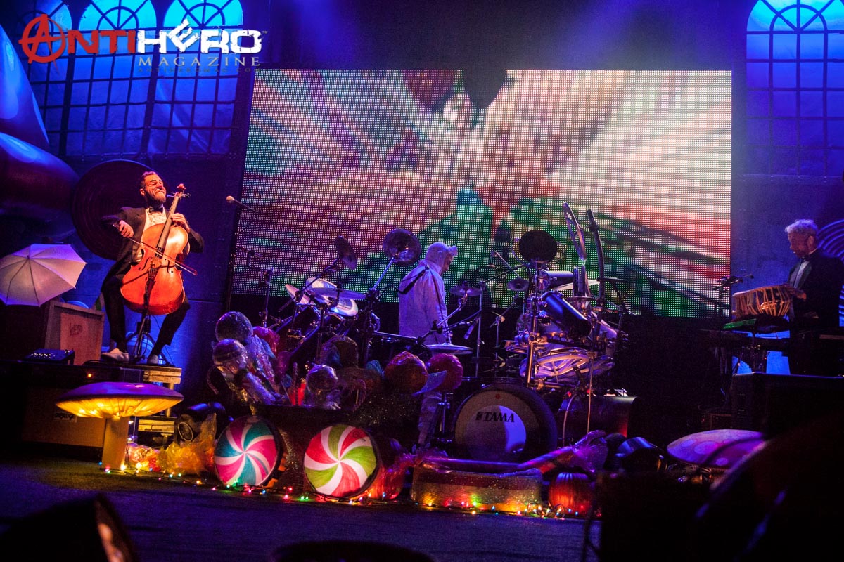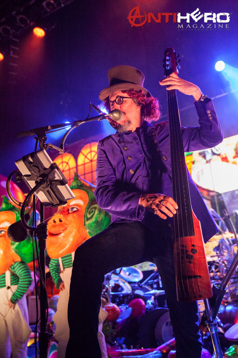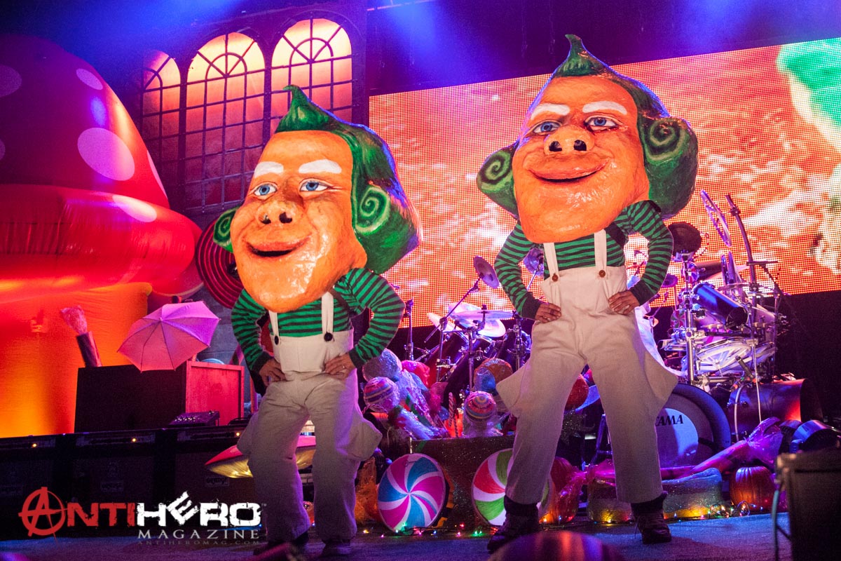 “We are the music makers…and we are the dreamers of dreams.” Strawberries, Snozzberries, Everlasting Gobstoppers, giant mushroooms, and Oompa Loompas doo-pa-dee doing their thing on stage, while Les Claypool, Larry “Ler” LaLonde, and Tim “Herb” Alexander of Primus performed their special magical blend of structured chaos at the Uptown Theater in Kansas City on Wednesday, May 6, 2015 along with the Fungi Ensemble – consisting of Sam Bass on cello and percussionist Mike Dillon. AntiHero Magazine photographer Thomas Woroniak got his Golden Ticket and this is what he witnessed. [separator style=”line” /]