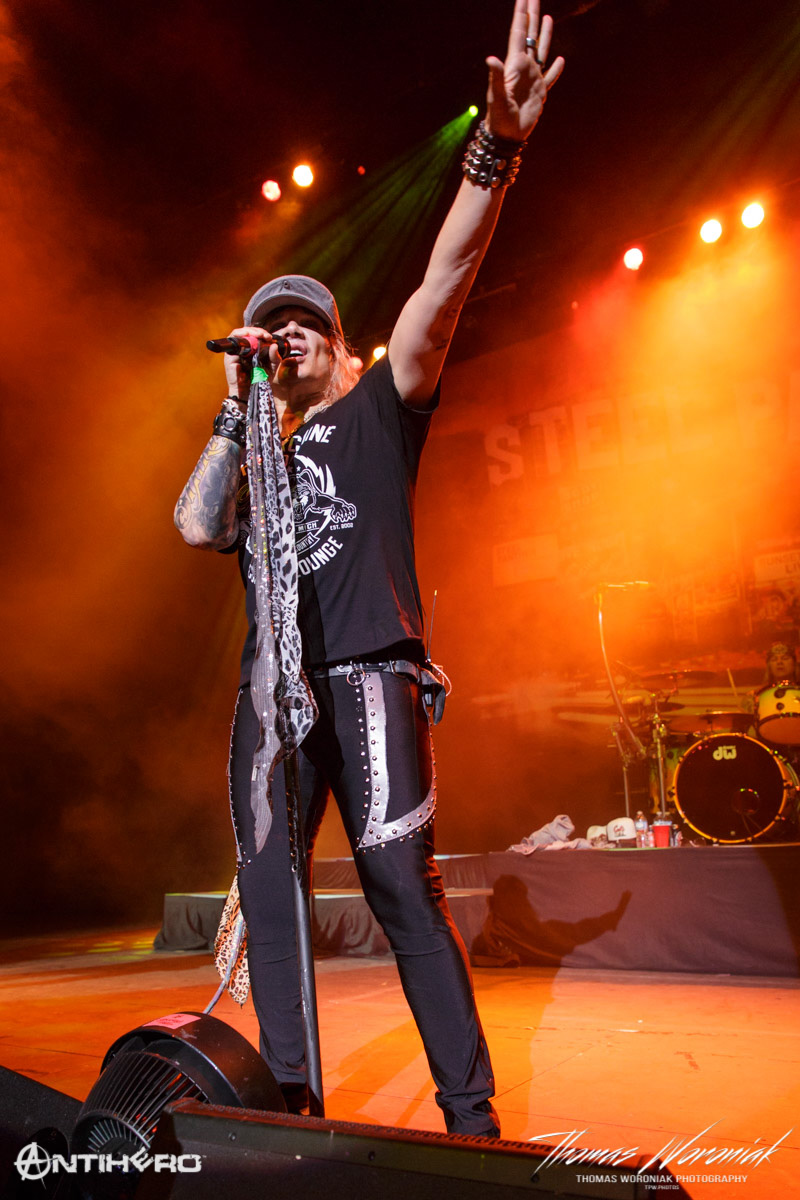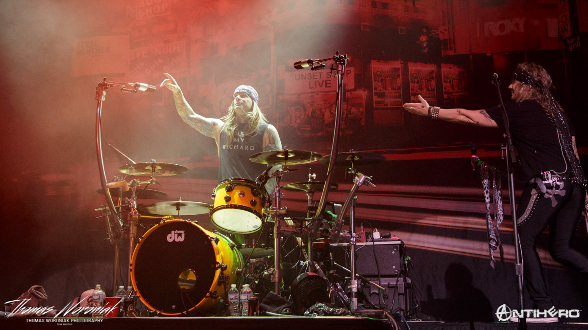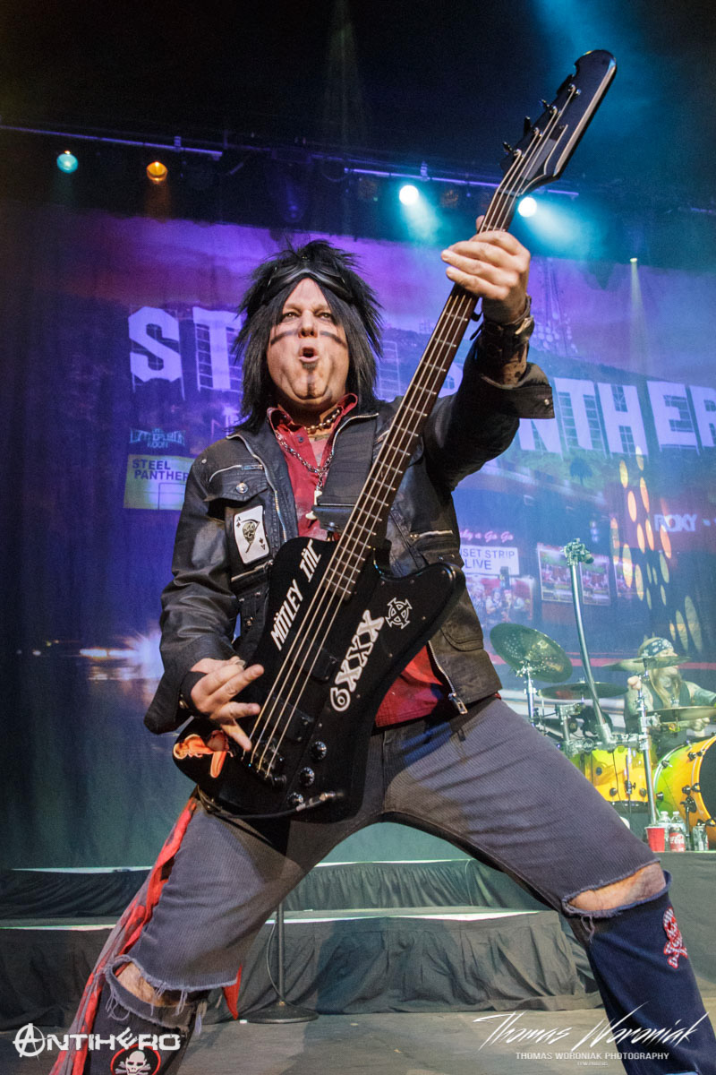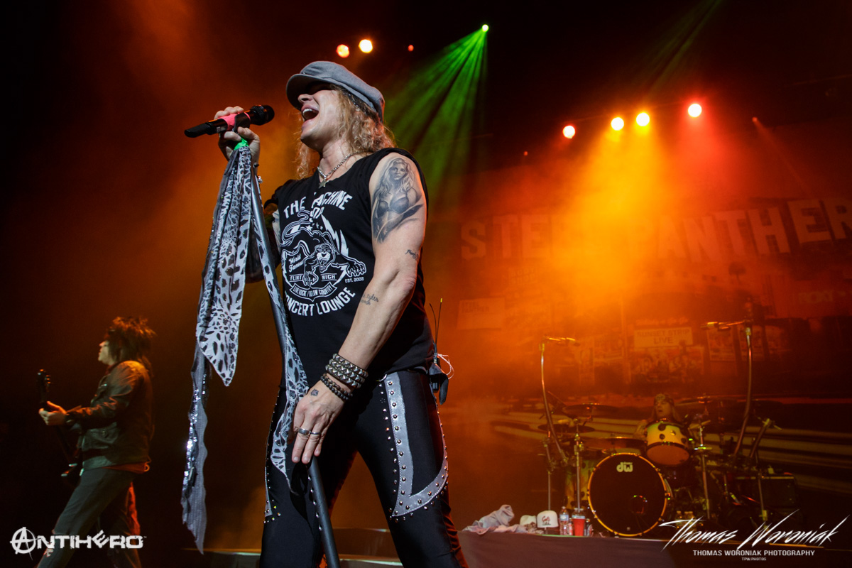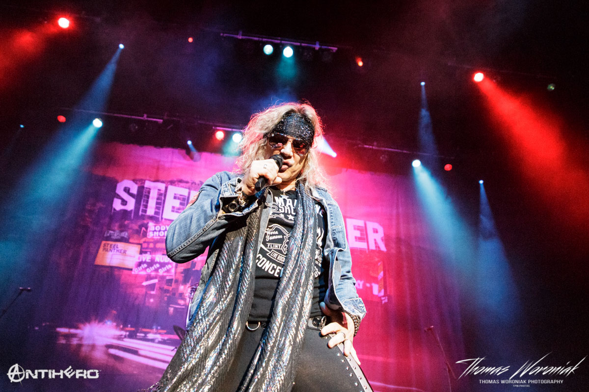 A few weeks ago, Steel Panther announced that bassist Lexxi Foxx would not be performing on the current US tour, as he has “voluntarily checked himself into an undisclosed sex rehab.” The band’s friend of over 30 years and backstage doorman Spyder has been filling in on bass for the upcoming tour dates. And while Foxx’s flamboyant and jokingly narcissistic stage presence was missed during the performance, Spyder performed surprisingly well blending in with the group’s stage chemistry and providing the low-end thump that kept the audience engaged in party mode.