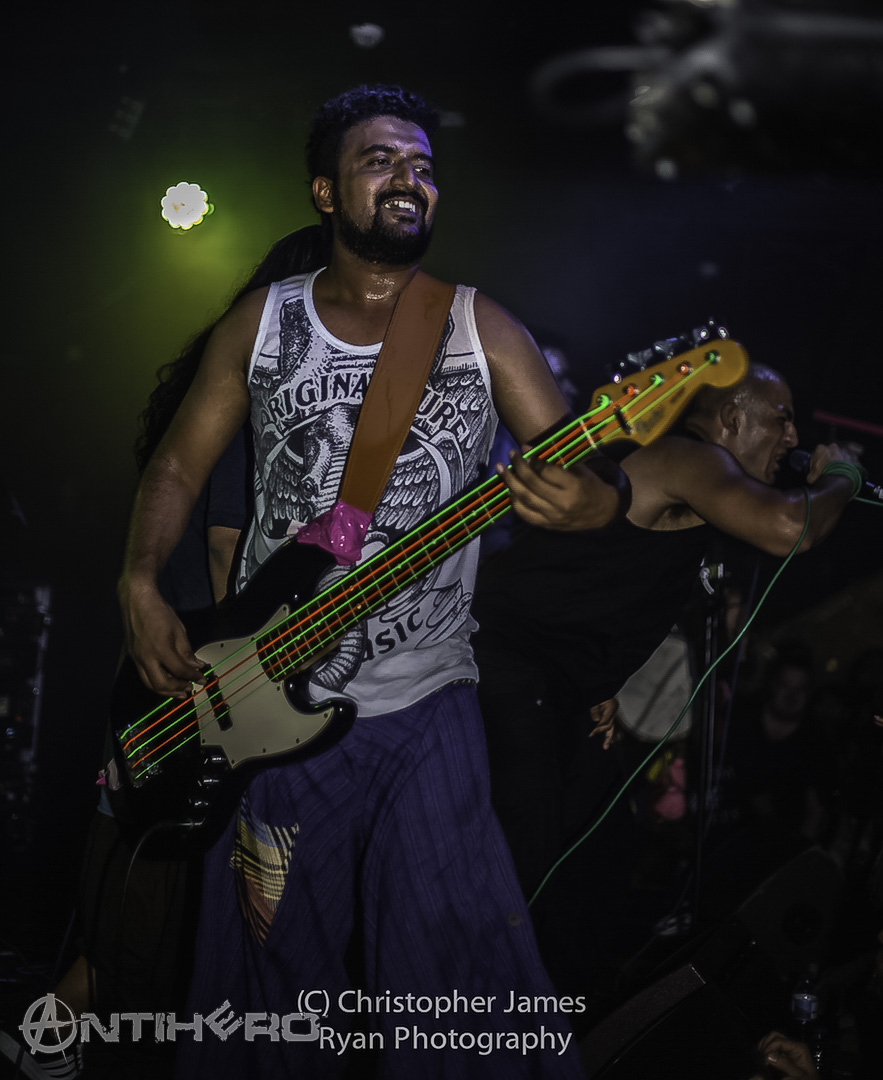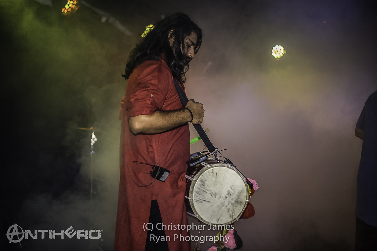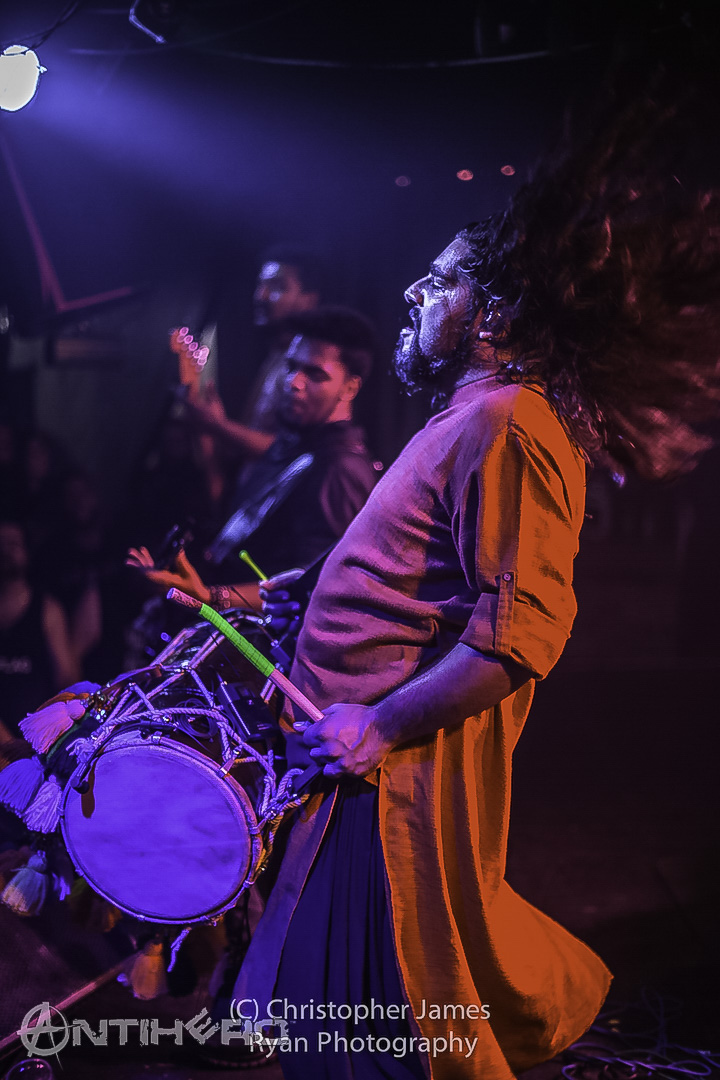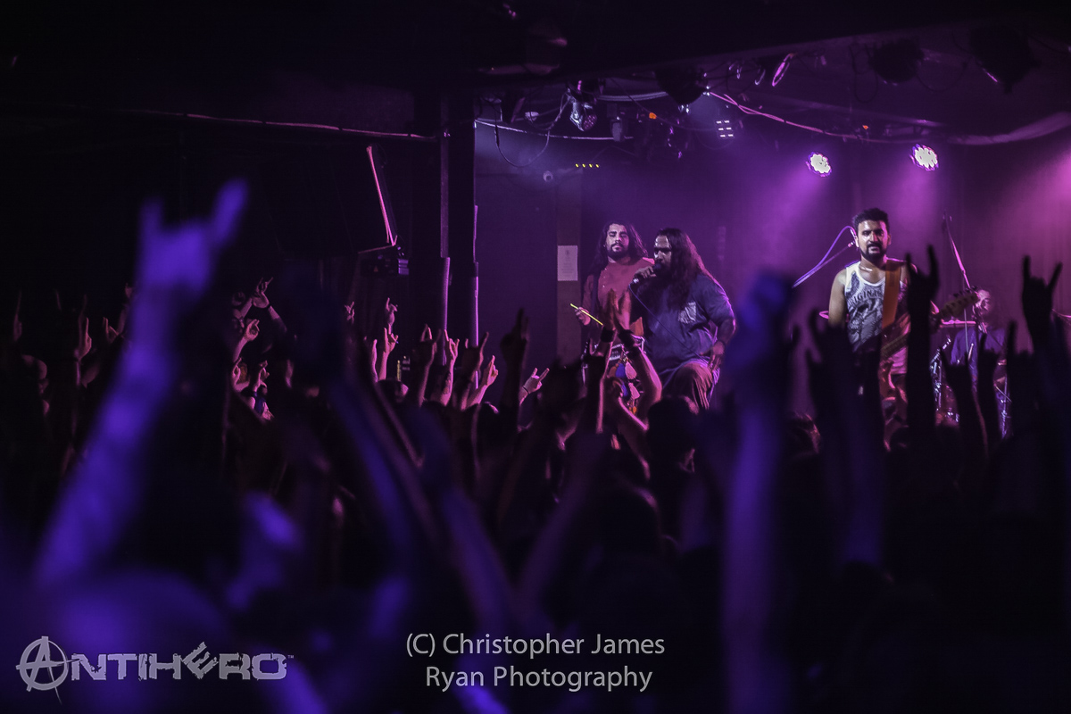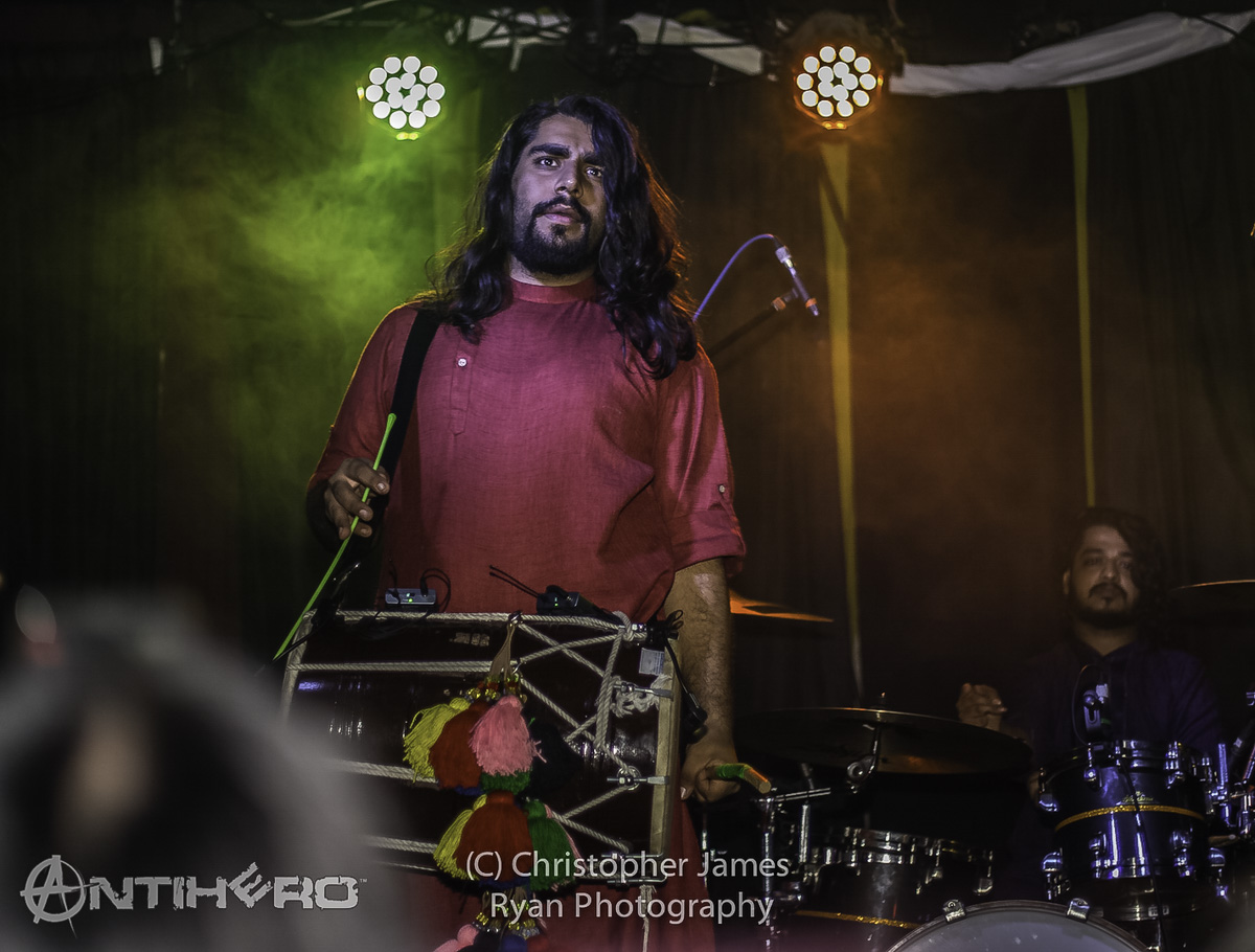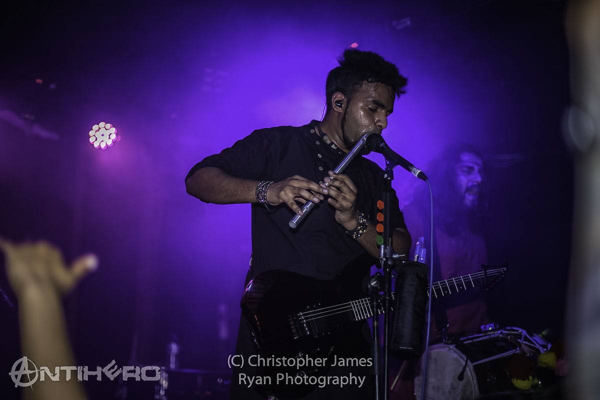 Due to work commitments, unfortunately, I was unable to arrive in sufficient time to catch the three support bands. However, by the time I arrived at Rebellion, it was pretty packed and close to a sellout show. I feel that at this point it is prudent to mention that I have seen many other bands with a considerable musical legacy play the same venue and fail to pull in the numbers that this band did -after only having a total of two songs available to the public. I squashed myself into the venue and fortunately managed to bag a raised position just beside the green room and sound mixing desk which afforded me a great view of the stage. After a short wait, the band literally exploded onto the stage in a ball of energy, all fighting for space on what appeared to be a stage that was far too small to contain all the energy that the Raj metallers offered up to a hugely enthusiastic audience. The combination of natural band instruments along with traditional choices worked well in a live setting. Prior to the show, I had expressed some reservations that the more unique elements of their sound would have been swamped with noise to their detriment. Fortunately, this was not the case as a great sound mix fused the two together in a harmonious combination.