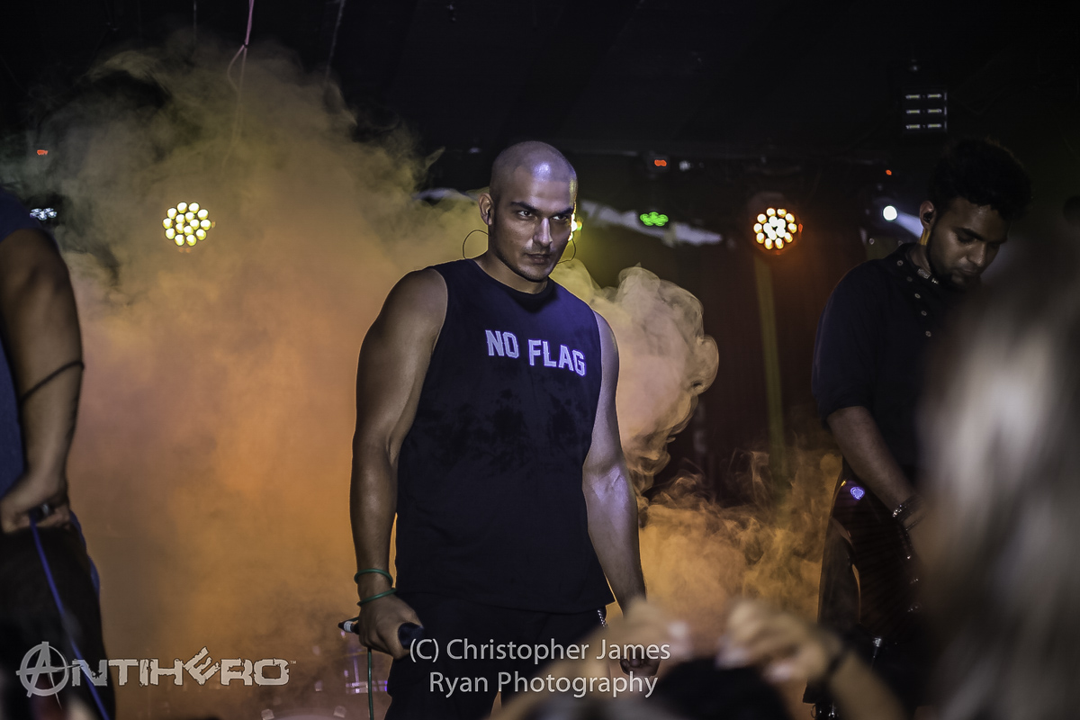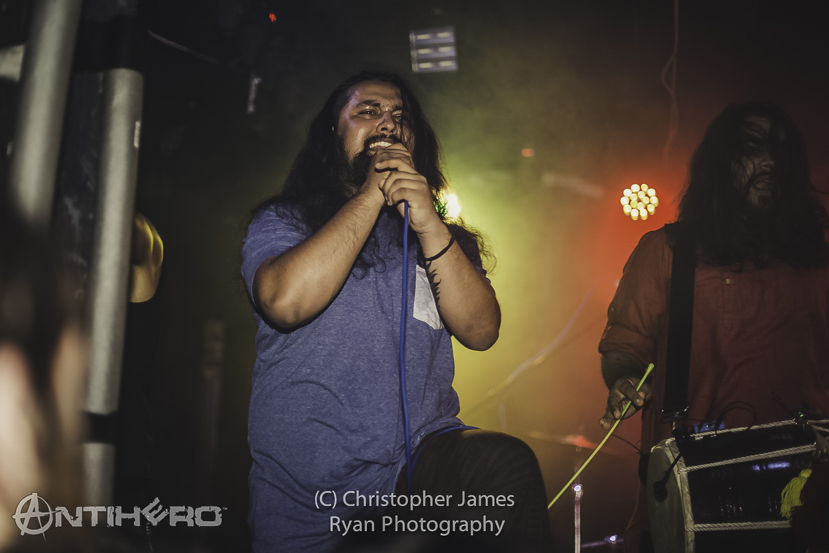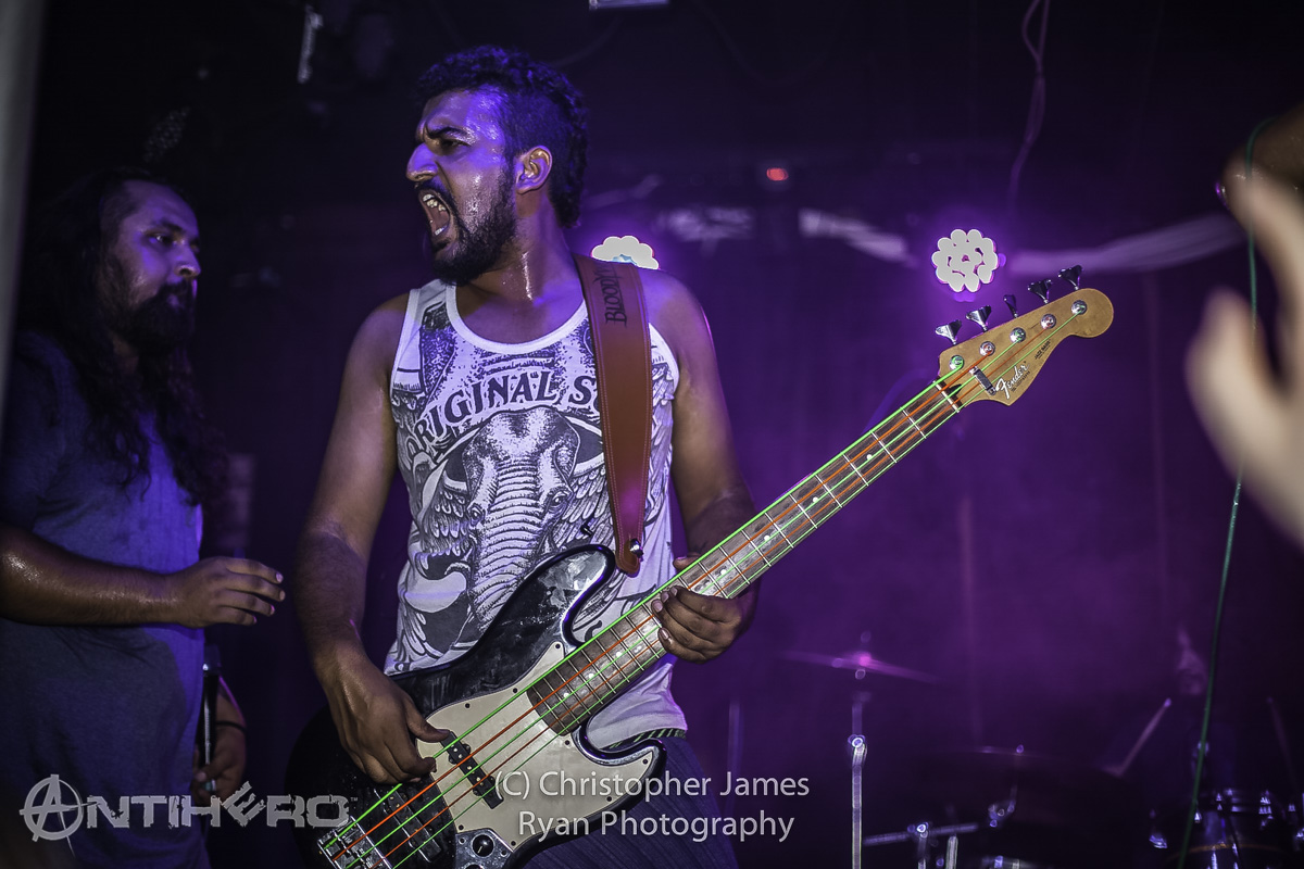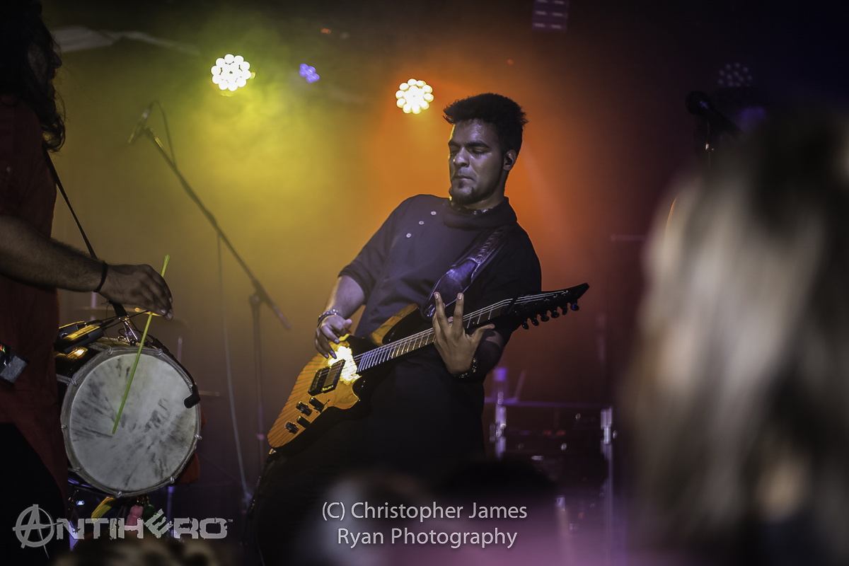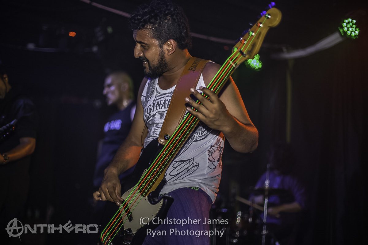 Due to work commitments, unfortunately, I was unable to arrive in sufficient time to catch the three support bands. However, by the time I arrived at Rebellion, it was pretty packed and close to a sellout show. I feel that at this point it is prudent to mention that I have seen many other bands with a considerable musical legacy play the same venue and fail to pull in the numbers that this band did -after only having a total of two songs available to the public. I squashed myself into the venue and fortunately managed to bag a raised position just beside the green room and sound mixing desk which afforded me a great view of the stage. After a short wait, the band literally exploded onto the stage in a ball of energy, all fighting for space on what appeared to be a stage that was far too small to contain all the energy that the Raj metallers offered up to a hugely enthusiastic audience. The combination of natural band instruments along with traditional choices worked well in a live setting. Prior to the show, I had expressed some reservations that the more unique elements of their sound would have been swamped with noise to their detriment. Fortunately, this was not the case as a great sound mix fused the two together in a harmonious combination.