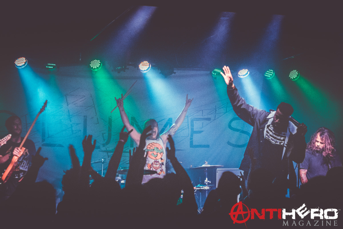 FFTG began their energetic six-song set with “Diversion,” which was quick and heavy from the get-go. They burst with double bass and had a perfect combination of clean singing and screams. Drew (guitarist) and Bonner (bassist) were so into it, they kept knocking over the backup mics. Flowing into “Composition“, AJ (vocals) asked the crowd to gather closer to the stage, which quickly proceeded into opening a pit. My favorite part of this song was the bridge; swimming into a groove with a splash of metal. It may have also been AJ’s dancing, as there was no doubt he was feelin’ the music. “Pretenders” had more of a slow yet powerful feel, another drum heavy song. AJ declared, “Side to side, get the fuck up!”, which led a fan running onto stage and diving into the crowd.