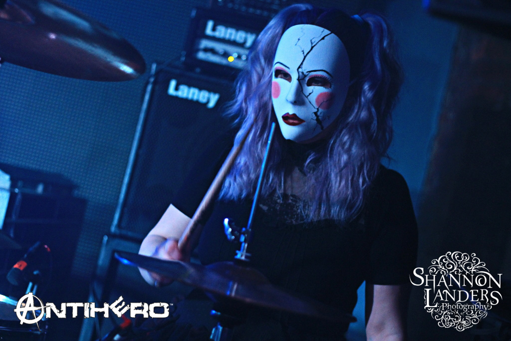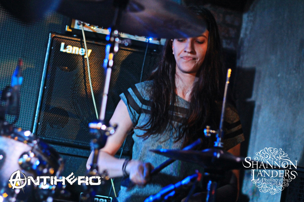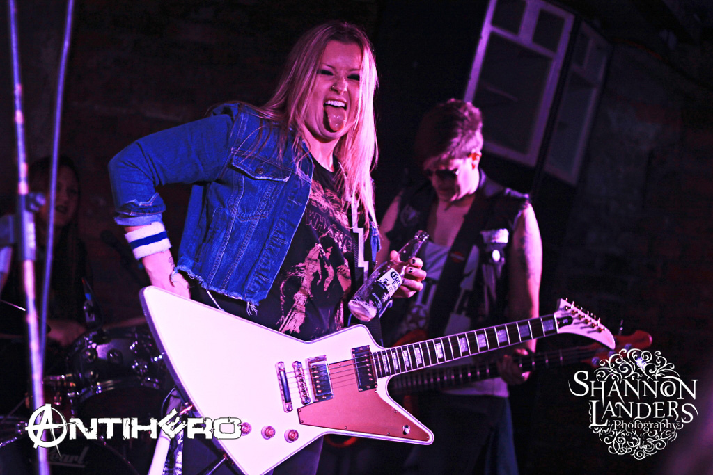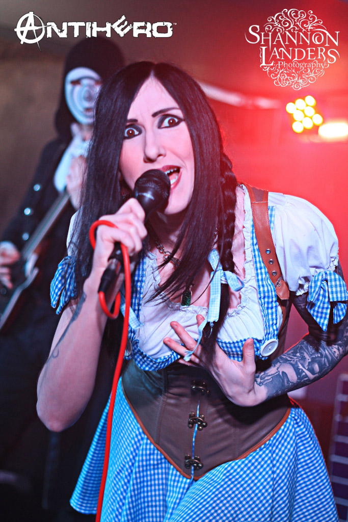 The Manchester event boasted ten kickass female-oriented bands, and the daunting task of opening up the stage was bestowed upon ‘character metal’ outfit, Splintered Halo. If you can imagine a cross between The Wizard of Oz’s Dorothy and the Wicked Witch of the West (think raven black pigtails tied with baby blue satin ribbons, sparkly ruby DM ‘slippers’ and leather Steampunk corsetry), then you’ve just pictured vocalist Evilyn Van Der Hyden. She intriguingly stepped out onto the stage in full costume, carrying a small wicker basket – and I couldn’t help but wonder what delights (or horrors) lay inside… Either way, Toto definitely wasn’t in there.