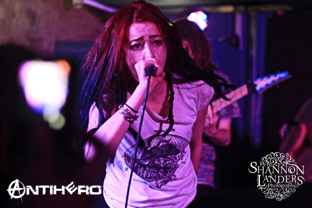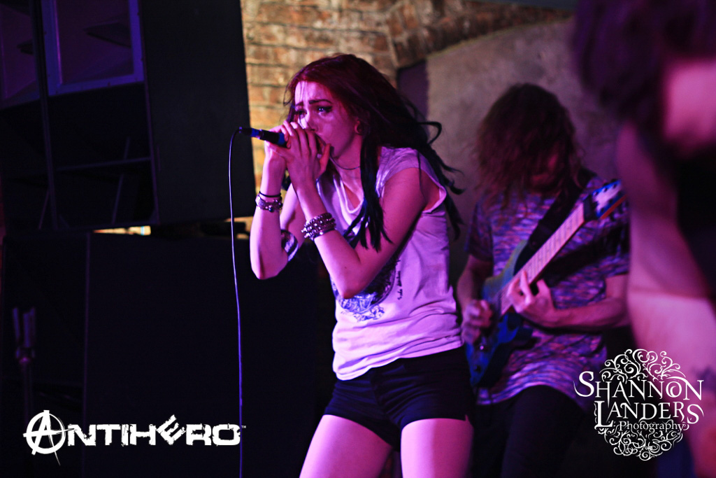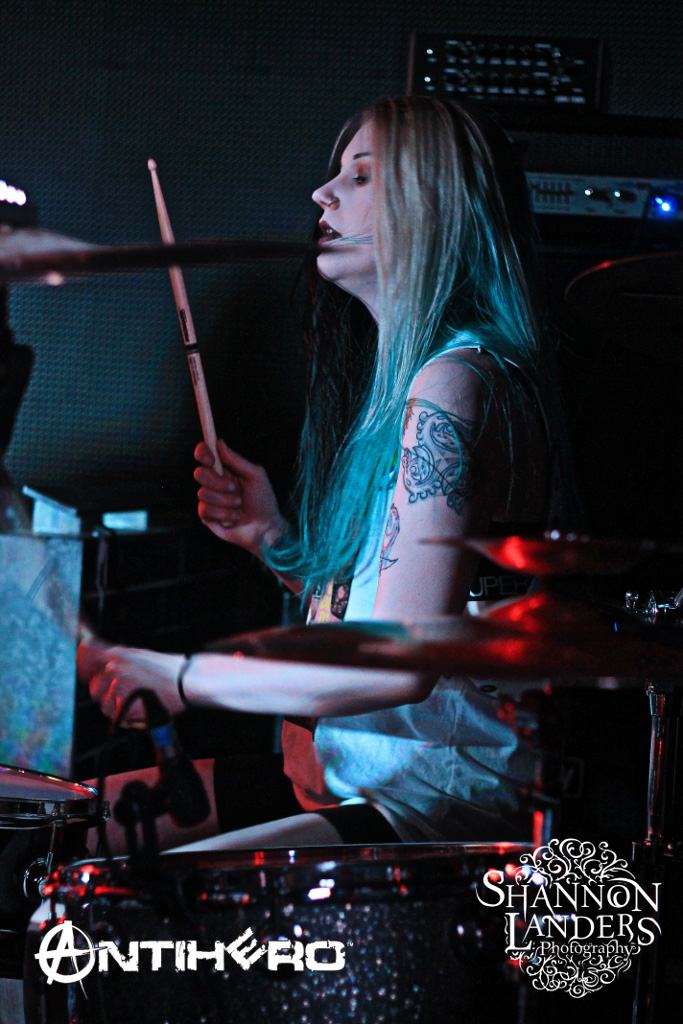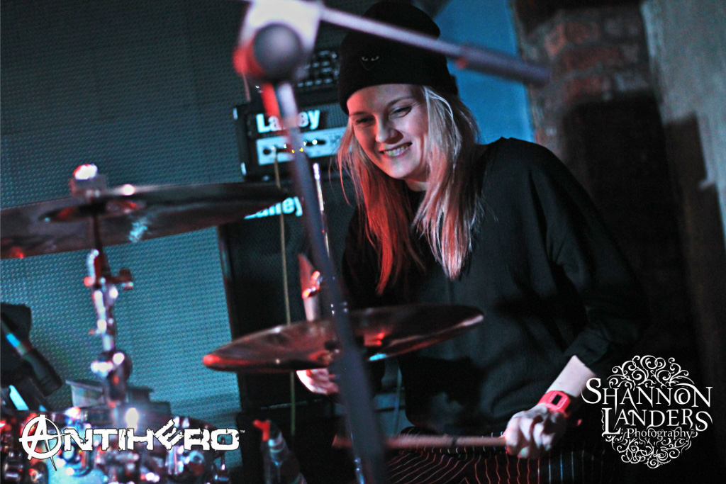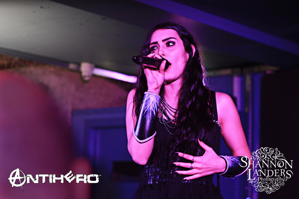 The Manchester event boasted ten kickass female-oriented bands, and the daunting task of opening up the stage was bestowed upon ‘character metal’ outfit, Splintered Halo. If you can imagine a cross between The Wizard of Oz’s Dorothy and the Wicked Witch of the West (think raven black pigtails tied with baby blue satin ribbons, sparkly ruby DM ‘slippers’ and leather Steampunk corsetry), then you’ve just pictured vocalist Evilyn Van Der Hyden. She intriguingly stepped out onto the stage in full costume, carrying a small wicker basket – and I couldn’t help but wonder what delights (or horrors) lay inside… Either way, Toto definitely wasn’t in there.