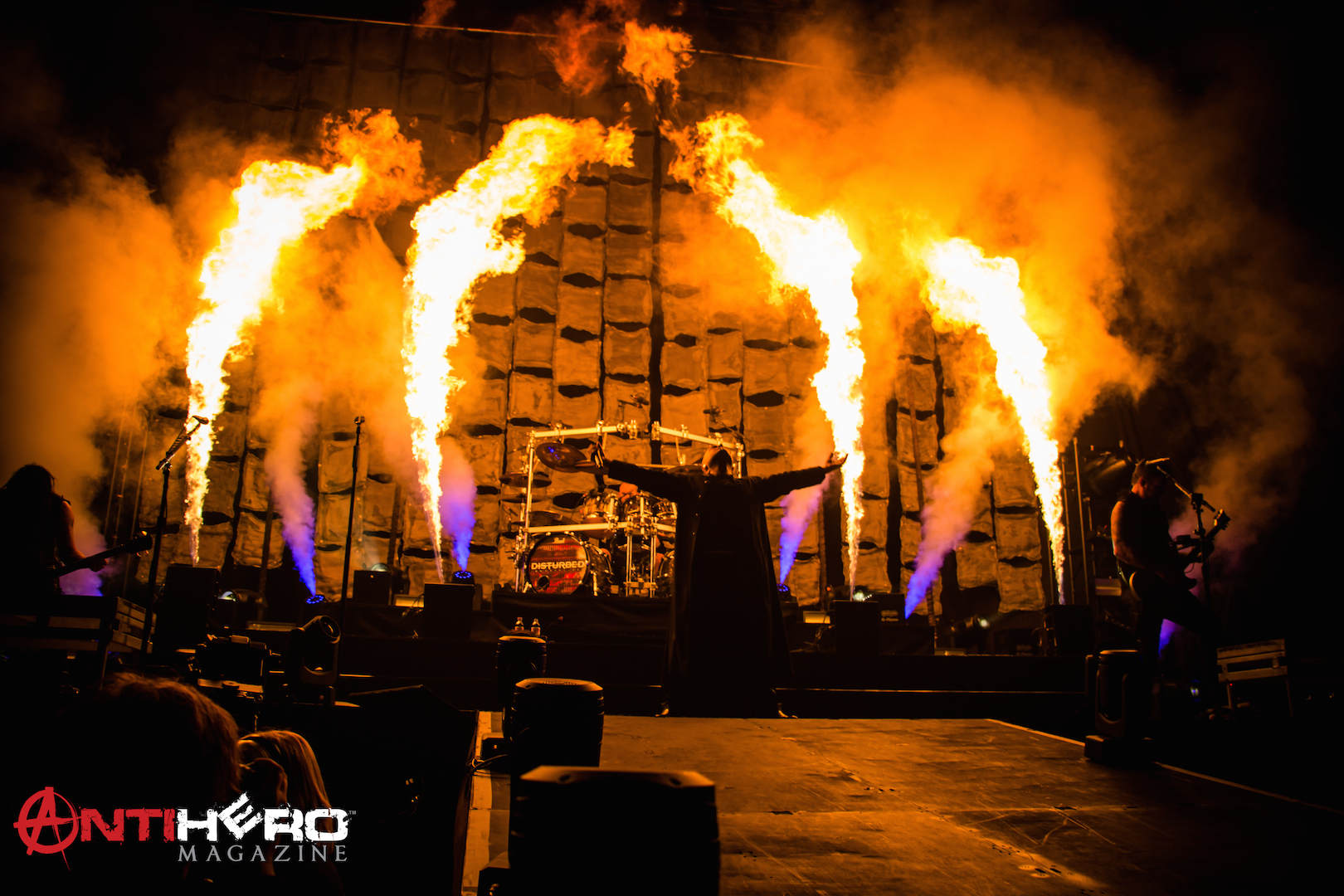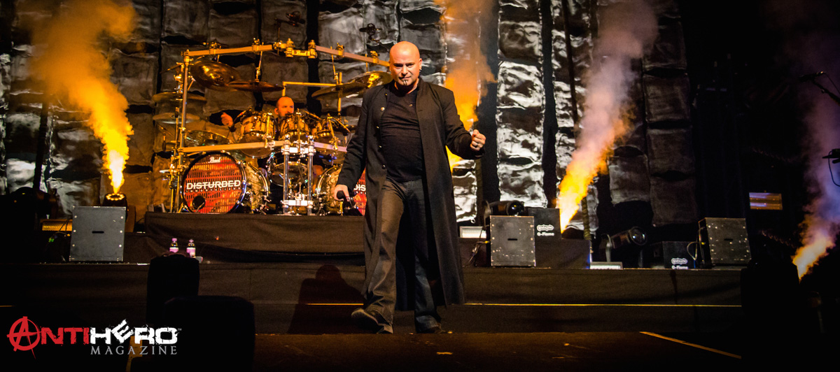 Suitably warmed up in a cold and almost full arena, there was just a short stage turn around before the Disturbed stage crew began to add their pyro apparatus. Last time I saw Disturbed was in a swamp at a UK Festival in the middle of summer. Unfortunately, on that occasion the natural weather elements took over and made short work of the expected delivered sonic overload. I felt sure that Disturbed would certainly prove worthy of their “special guests” billing. Opening with the instrumental first track from their latest album Immortalized, the band started into “Eye of the Storm” with its melodic guitar intro before moving into the brutality of the album’s title track – and the visual spectacle was underway.