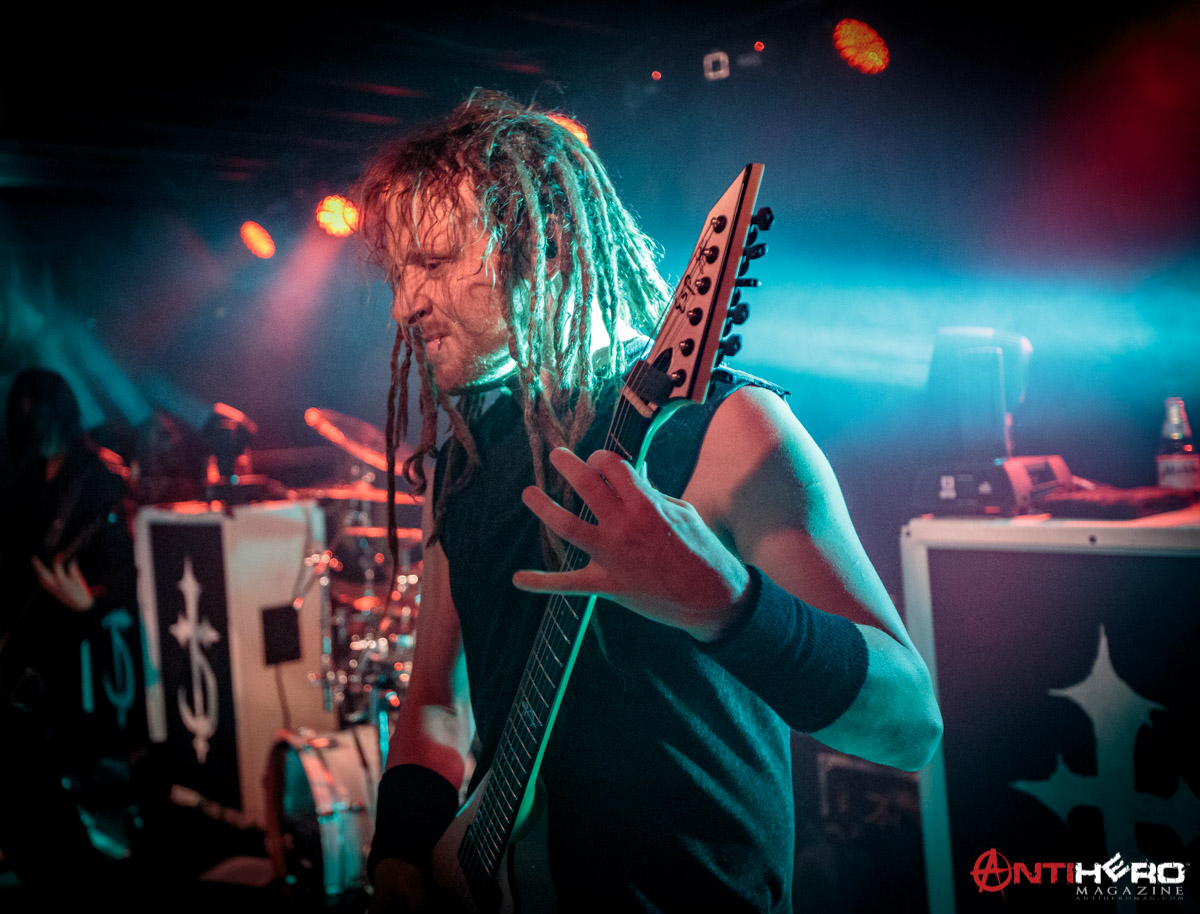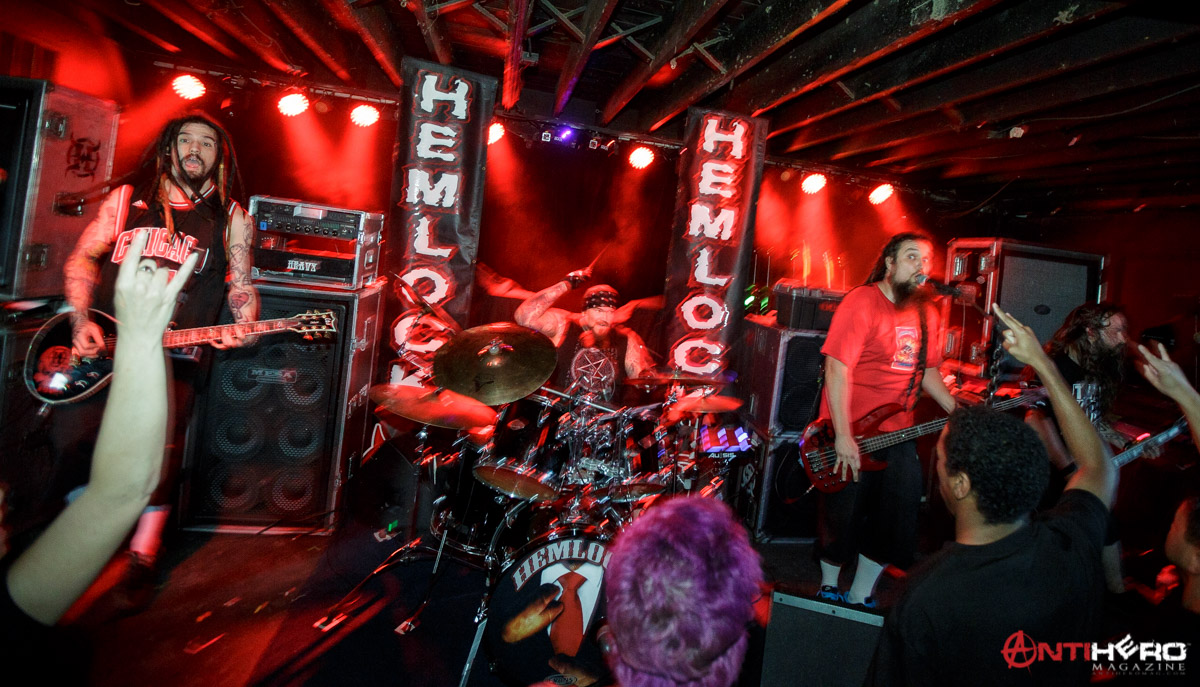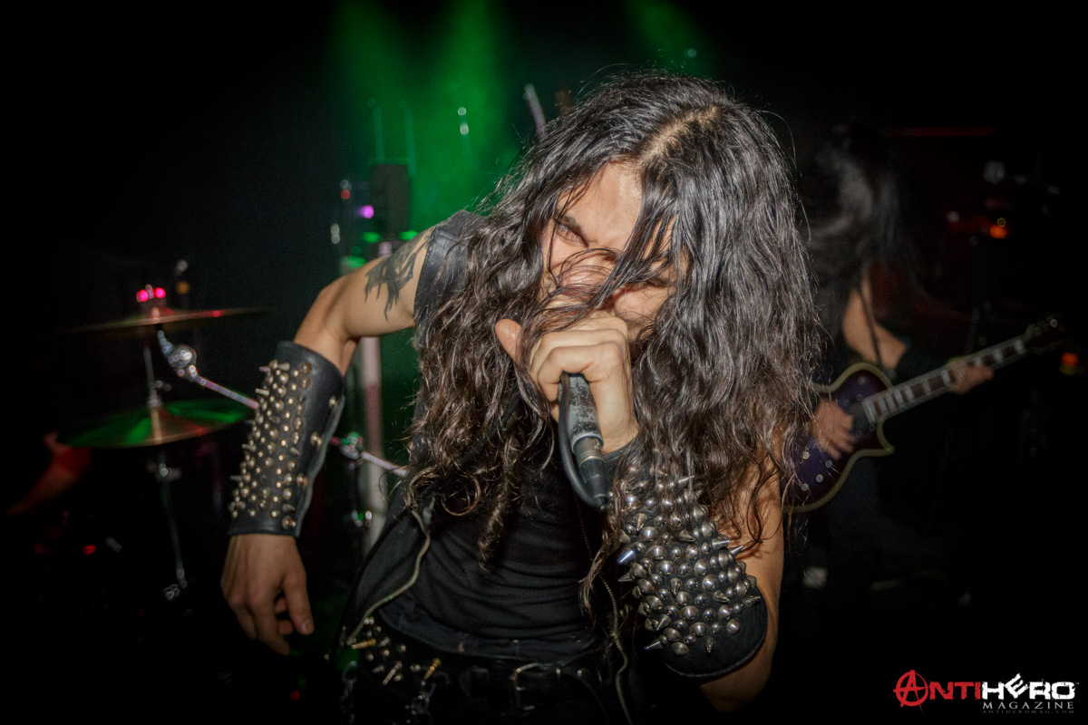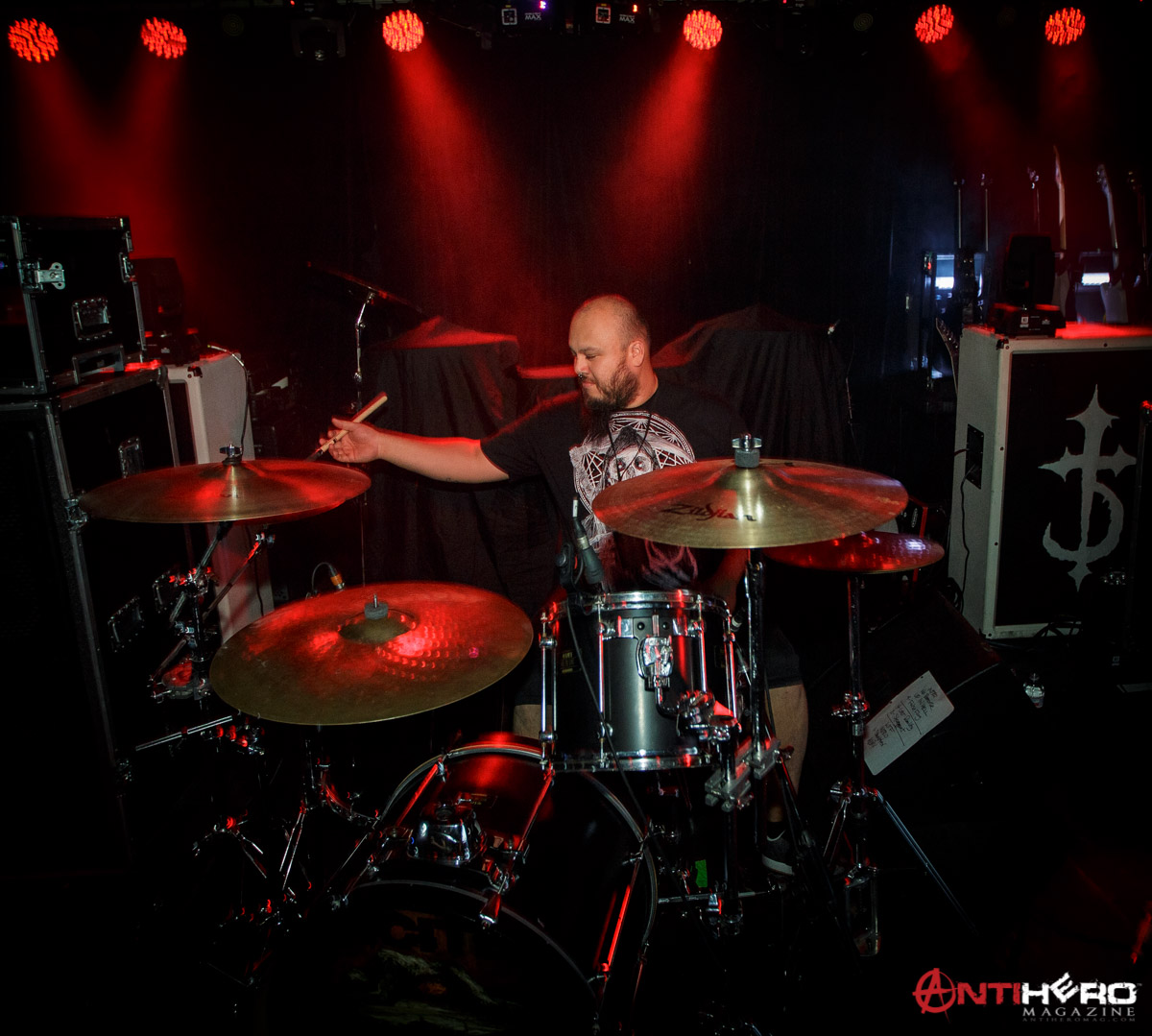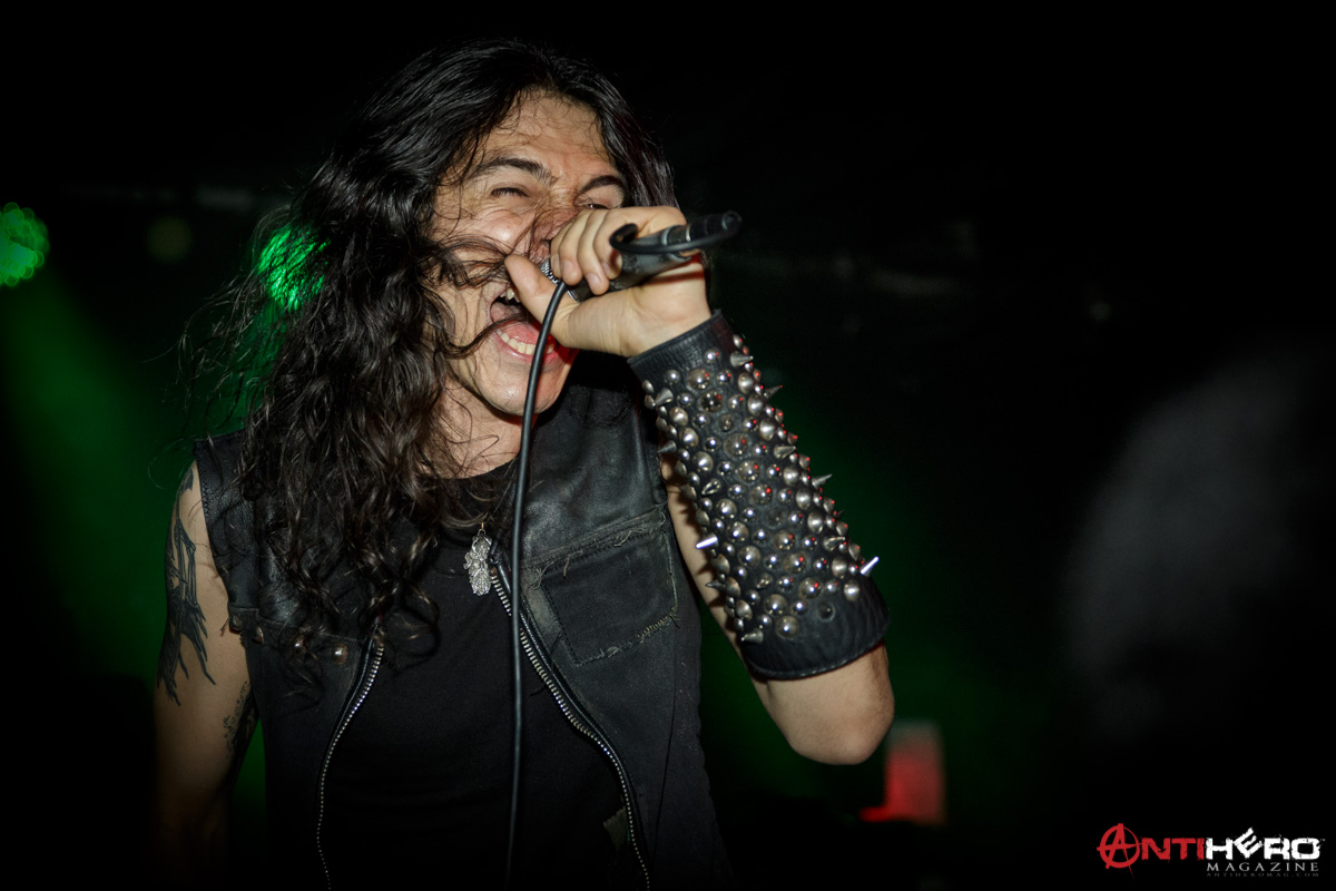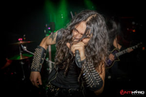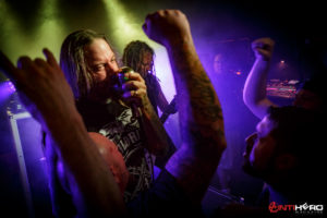 Opening band Hemlock originally hail from Las Vegas, but have all moved to within easy driving distance of Kansas City, so they have played around town quite frequently, but this was my first chance to catch them personally. In the words of Gob Bluth, I have made a terrible mistake. I wrote Hemlock off as past their prime imitators, but after their incredible thirty-minute set, I have no idea how this band has been around for almost 25 years without becoming a household name for metalheads. The Riot Room stage is already small, and having 4 bands worth of gear on stage shrunk their available space to “barely enough to stand still,” but this didn’t stop them from headbanging, jump-kicking, and shredding their way through a set that was far heavier and far less power metal than I expected. In fact, the closest comparison to Hemlock‘s sound I can think of is replacing Hed P.E.’s vocals with pure, traditional metal screams, including everything from guttural pig squeals to The Black Dahlia Murder style high-pitched shrieks but focusing on a throaty, classic metal roar most akin to Phil Anselmo, all done to perfect by vocalist/bassist Chad Smith. Drummer Brian Smith was also eye-catching, frequently hammering out fills one-handed while holding a stick high in the air with the other hand, and even tossing in the occasional windmill swing on the cymbals. The entire band was great at engaging with the crowd and getting people fired up for the evening to come – I’ve never seen an opener get the entire crowd jumping to every song, but they managed it. Hemlock is worth the price of admission to this tour all by themselves.