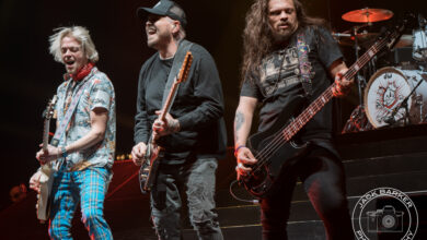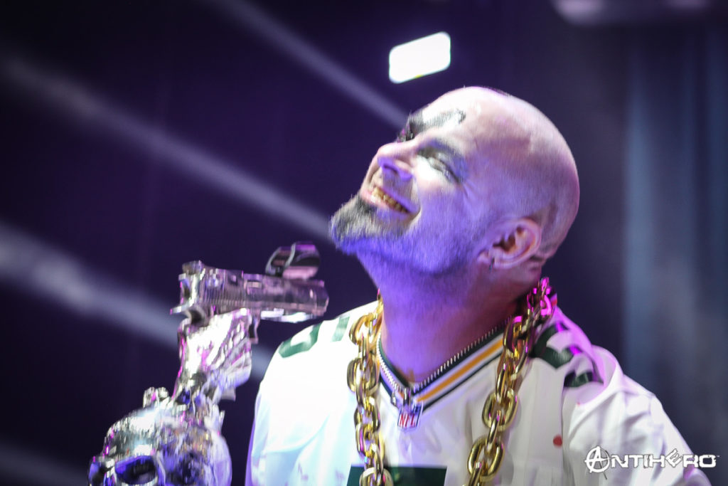 Picture this, me, in the photo pit, getting sweat on by the man, the myth, the legend, Ivan Moody. Yes, I was that close. Let me tell you, it is really hard to focus on getting good pictures when you are absolutely as close as you can be to a phenomenal band like Five Finger Death Punch. Yes, you got me, I fangurled for a moment there, having direct eye contact with Chris, Ivan, and Jason – it was impossible to not fangurl. I was so frantic to capture the best pictures possible and enjoy the music, I was kind of in a trance, so when I finally looked at Ivan Moody’s feet, I felt like a dummy. I had totally forgotten Moody had a broken hoof. By the way, Moody was running from side to side of the stage, jumping up on platforms – there is no way a person would ever think he was injured at all. I realized later that Moody had a cane with him at certain times, but I think that was more for appearances because it was a really badass cane!