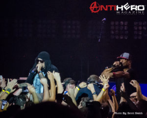 The show started calmly with DJ Lord taking the stage, stating “I’m here to warm you up.” DJ Lord started mixing tunes from Nirvana, Black Sabbath, KRS-One, and Jimi Hendrix amount others. He showed off his prowess as a DJ with each song he played, and to the delight of the crowd, he tossed in the Star Bangled Banner to the mix. When DJ Lord finished, the stage lights dimmed and pavilion lights were turned off.