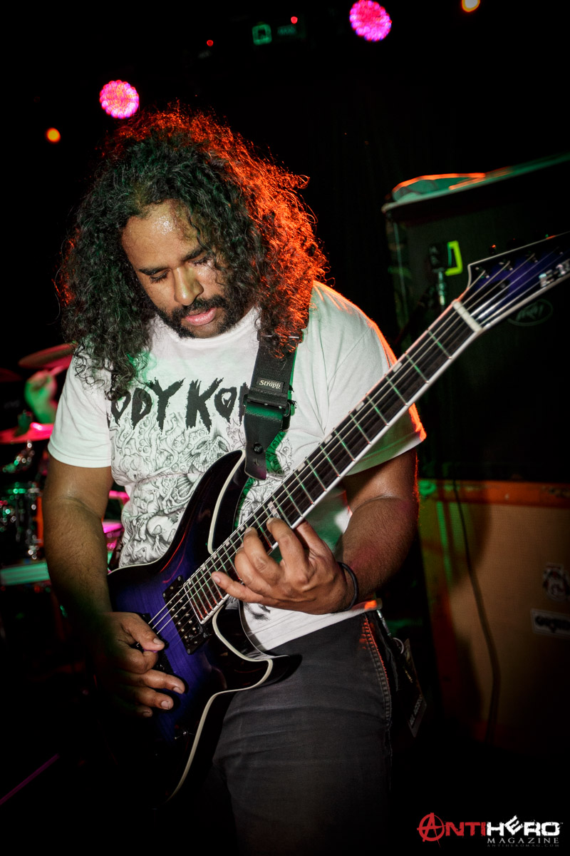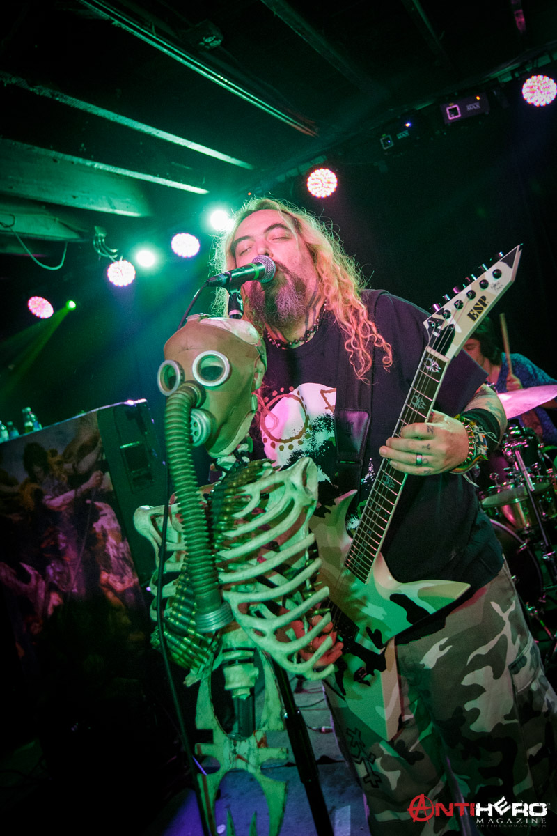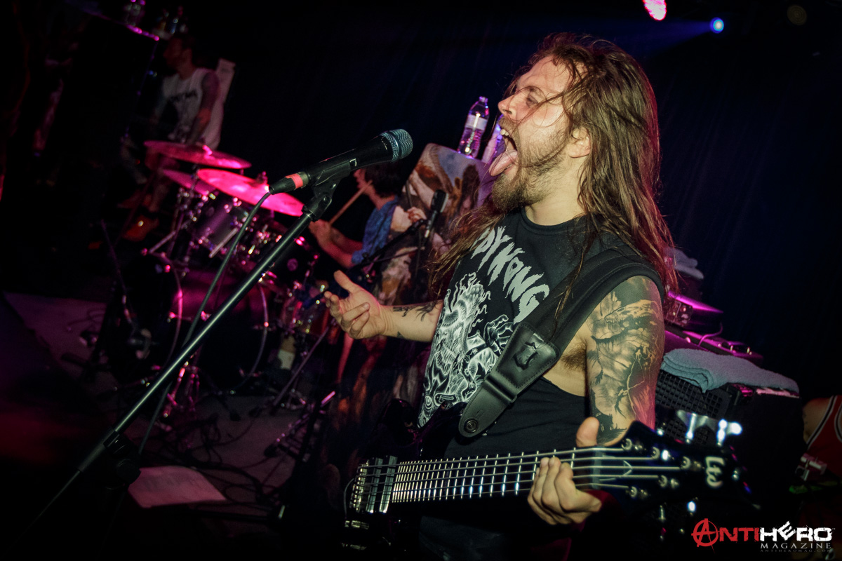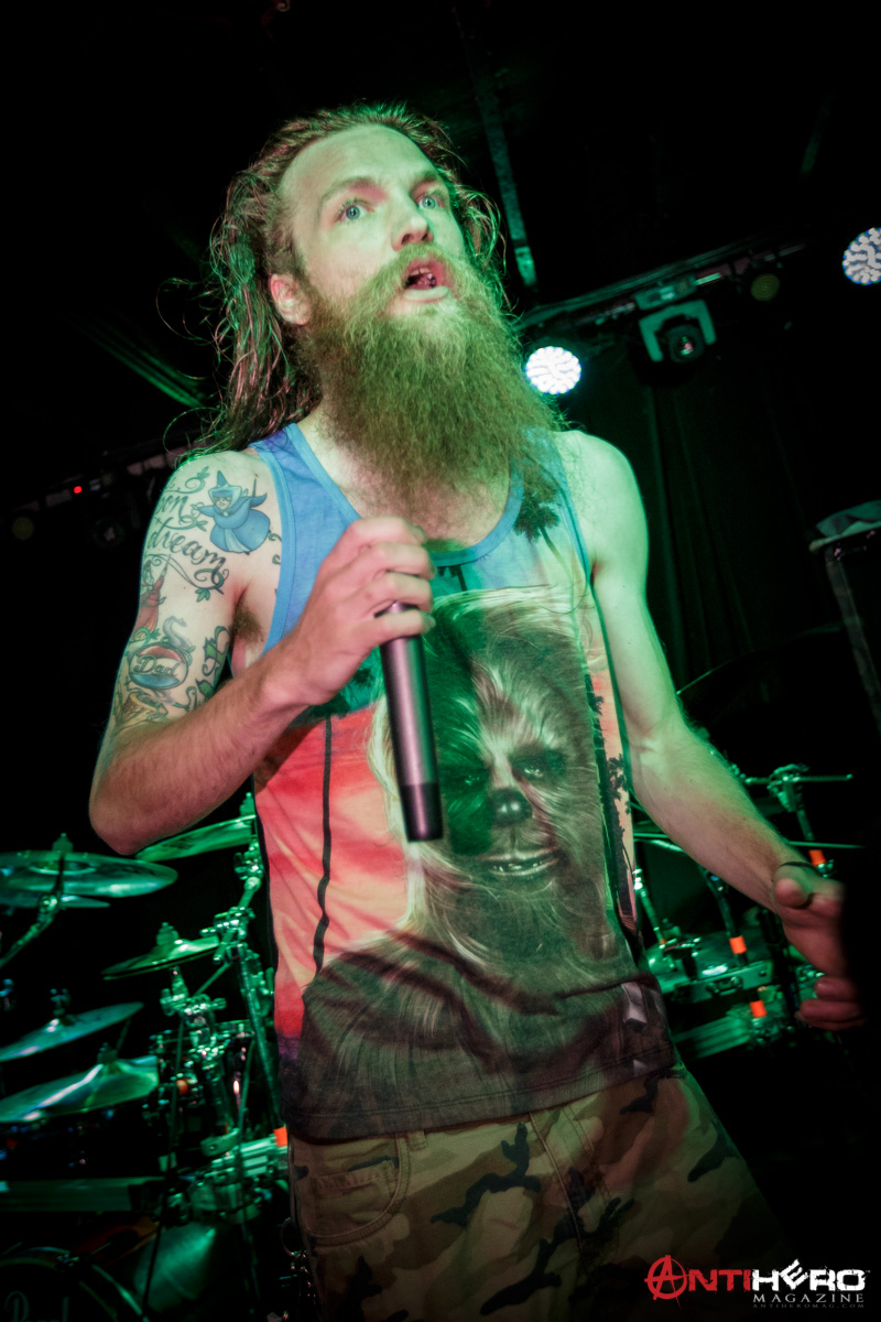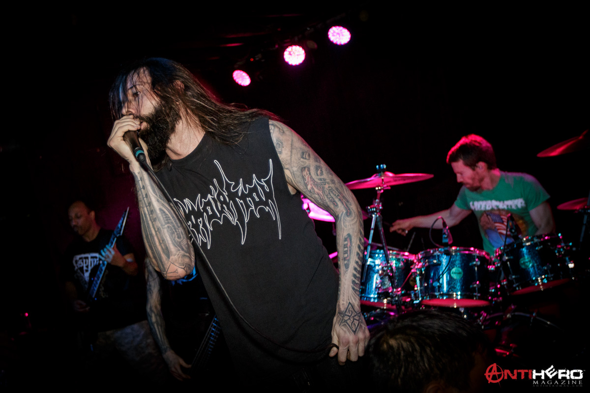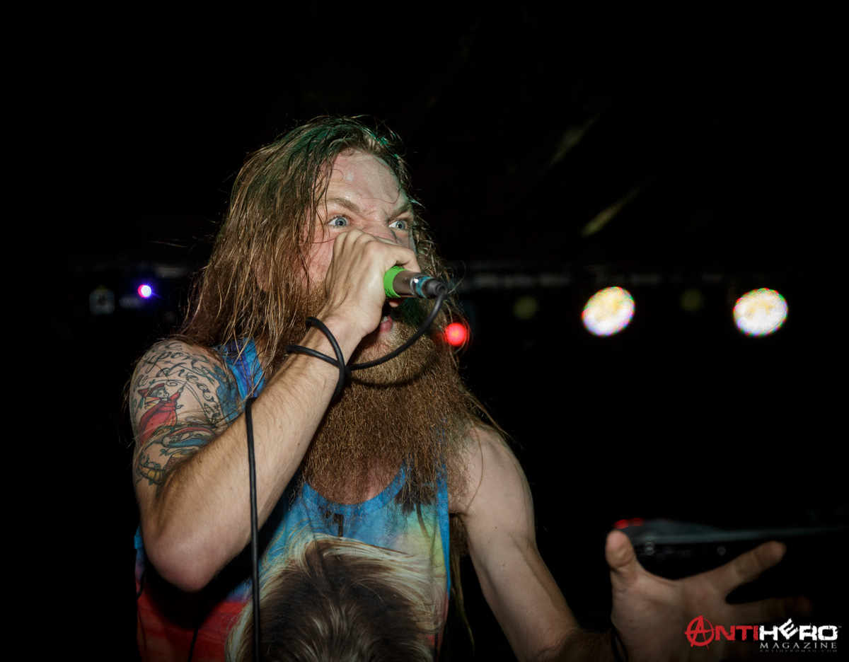 After that was Canton, Michigan thrash metal band, Battlecross. The emphasis in their sound is certainly on the metal, but thrash heavily flavors the melodic segments and the captivating solos, of which there was at least one per song, usually more. Guitarists Hiran Deraniyagala and Tony Asta frequently harmonized or traded back and forth through passages equally indebted to Iron Maiden and Kill ‘Em All-era Metallica. Frontman Kyle “Gumby” Gunther loped around the stage looking like Encino Man in a tie-dye tank top bearing the face of Chewbacca, and that sense of fun was present in their set, which was the lightest of the night but was a welcome refresher after the intensity of the first two acts. The only downside was the volume was far too loud, leaving the vocals sounding thin and just seeming out of place when all the other bands had an excellent mix.