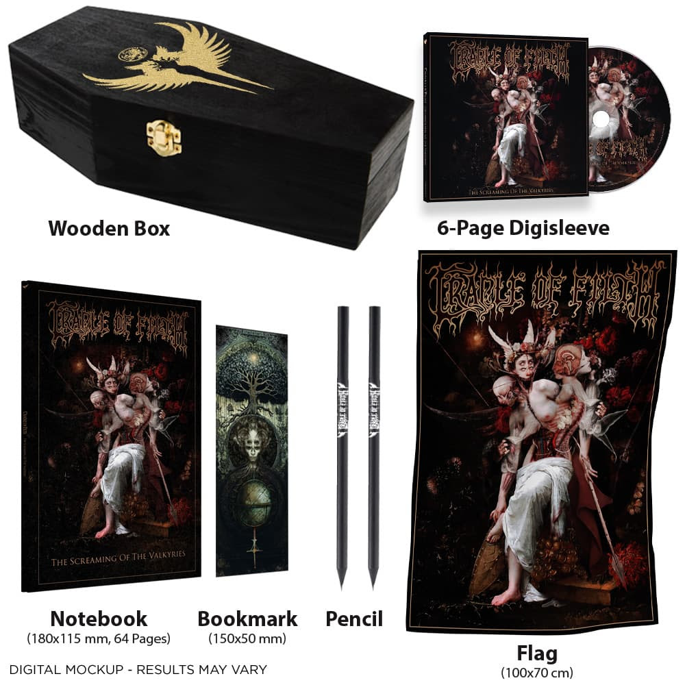 Produced, recorded, mixed and mastered by Scott Atkins at Grindstone Studios in Suffolk, England, The Screaming Of The Valkyries beckons the brave into a new era of CRADLE OF FILTH misadventure, celebrating melancholic melody, blackened thrash, and apocalyptic existential dread with a grinning smattering of unbridled revelry. The Screaming Of The Valkyries is a bloody, dark love letter to the longtime legion of CRADLE OF FILTH faithful and a stunning entryway for fresh lambs to the sonic slaughter.