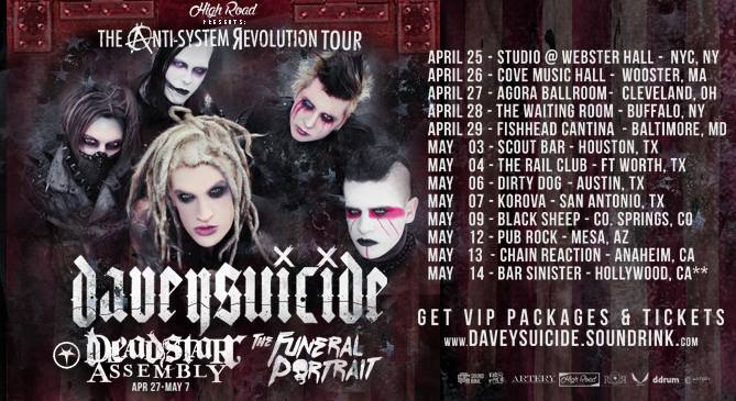 Fresh off of recording their upcoming third studio album, due out this summer, Davey Suicide has amassed a monster line up for the “Anti-System Revolution Tour.” Davey Suicide has been captivating the underground by fusing arena rock, gutter grit, sleaze, and theatrics into their own brand of industrial rock. The band, which features Davey Suicide along with Drayven Davidson, Needlz, Niko Gemini, and Derek Obscura, distills heavy metal, industrial, and punk into anthems that are as corrosive as they are catchy. After spending the last 4 years extensively touring the US (as well as one tour of the UK), Davey Suicide is wrapping up their World Wide Suicide Tour cycle on the Juggalo Invasion Tour and the Anti-System Revolution Tour.
