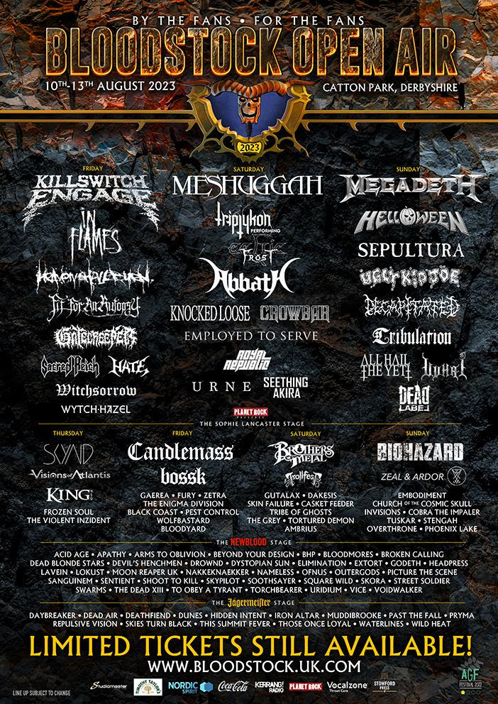 BLOODSTOCK’s 2023 Ronnie James Dio main stage headliners are KILLSWITCH ENGAGE, MESHUGGAH, and MEGADETH. Also appearing are HELLOWEEN, IN FLAMES, BIOHAZARD, EMPLOYED TO SERVE, ROYAL REPUBLIC, SACRED REICH, HEAVEN SHALL BURN, SEPULTURA, FIT FOR AN AUTOPSY, CROWBAR, CANDLEMASS, TRIBULATION, SEETHING AKIRA, UGLY KID JOE, DECAPITATED, GATECREEPER, ZEAL & ARDOR, KING 810, ABBATH, URNE, ALL HAIL THE YETI, DEAD LABEL, BOSSK, CHURCH OF THE COSMIC SKULL, BROTHERS OF METAL, PEST CONTROL, GUTALAX, UUHAI, INVISIONS, COBRA THE IMPALER, TROLLFEST, SKYND, FROZEN SOUL, EMBODIMENT, THE VIOLENT INZIDENT, TRIBE OF GHOSTS, DAKESIS, THE ENIGMA DIVISION, THE GREY, AMBRIUS, TUSKAR, STENGAH, OVERTHRONE, TORTURED DEMON, CASKET FEEDER, GAEREA, BLOODYARD, WOLFBASTARD, EMBODIMENT, SKIN FAILURE, WITCHSORROW, WYTCH HAZEL, HATE, BLACK COAST, PHOENIX LAKE, ZETRA and more.