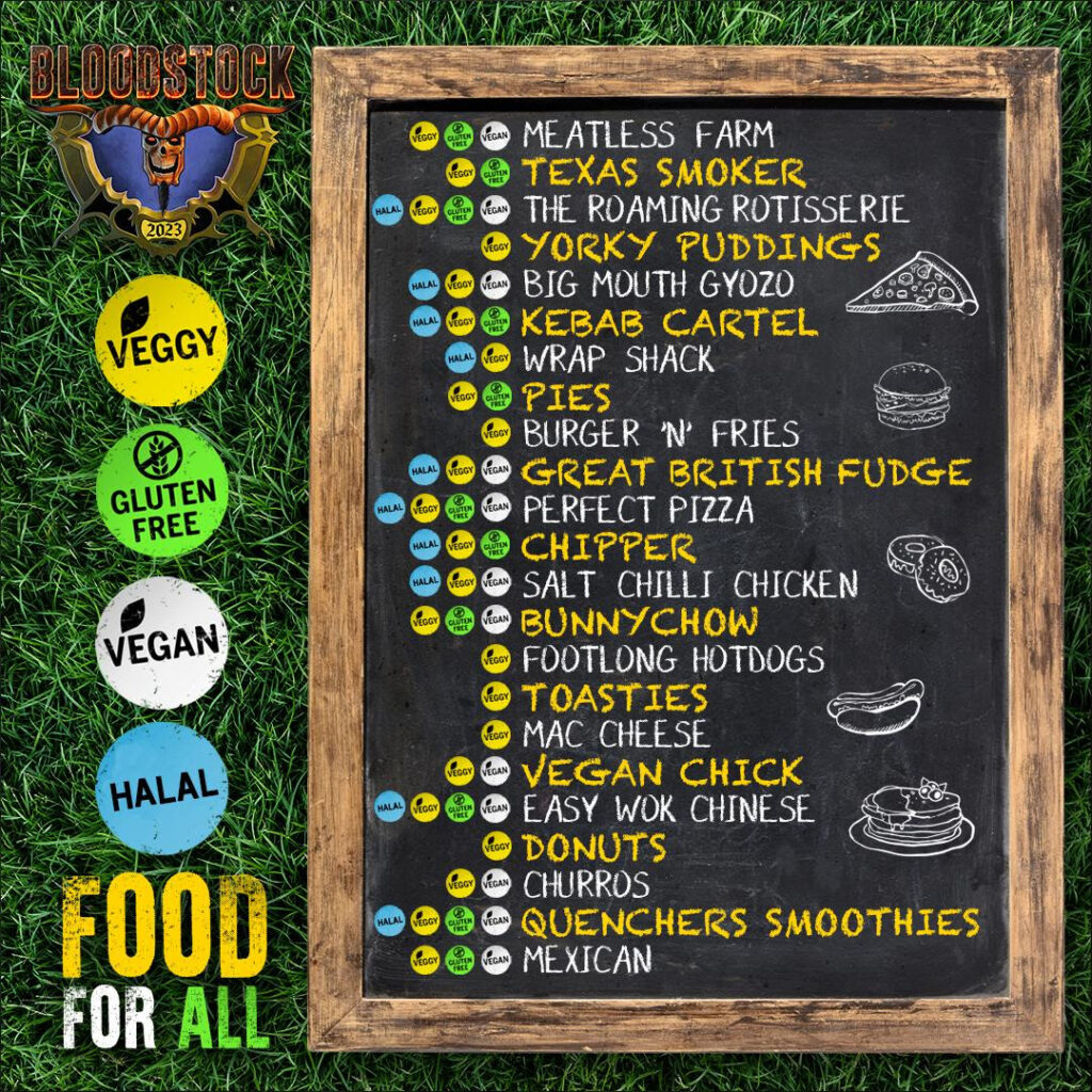 Whether you’re vegan, veggie, meat-eating, or seeking something gluten-free or halal, BLOODSTOCK has a wide range of food available onsite. Here’s just a few options… burgers, pizza, tacos, burritos, gyoza, waffles, crepes, toasties, smoked meats, chicken, noodles, pies, giant Yorkshire puds, baguettes, fish & chips, fries, hotdogs, kebabs, donuts/churros, mac n’ cheese, wraps, nachos, fudge, the infamous black ice-cream, and more – and Bunnychow is back too! Check out more info here and there’s a handy graphic below to help you keep track of which food stands to head to first.