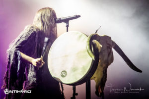 Thursday headliners Arkona stun again and again throughout their hour-plus set: their unique MO of fusing Russian folk music with progressive metal gives them an enigmatic shine matched only by their stage presence. Frontwoman Maria Arkhipova is an unstoppable force, constantly mobile and shrouded in darkness as she either hums out luscious melodies or growls angrily over her band’s unique and diverse instrumentation.