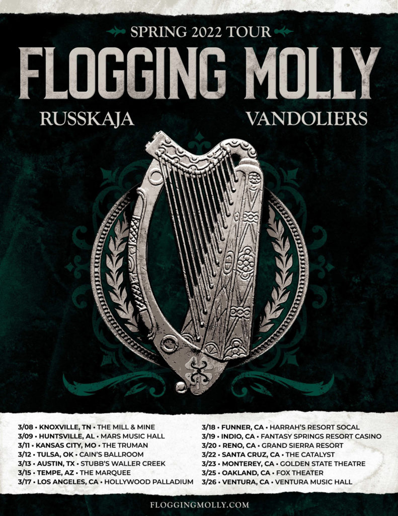 Flogging Molly play The Truman in Kansas City tomorrow night, with the eagerly-awaited return of the group’s venerated annual St. Patrick’s Day festival happening next Thursday at the Hollywood Palladium. Having live-streamed the 2021 event, the band mix the best of both worlds for 2022, with the concert being broadcast worldwide via a simultaneous livestream (tickets: Floggingmolly.veeps.com). Flogging Molly set sail on March 28, helming the sold-out Salty Dog Cruise, which also includes performances from the Descendents, Frank Turner, Agent Orange and more.