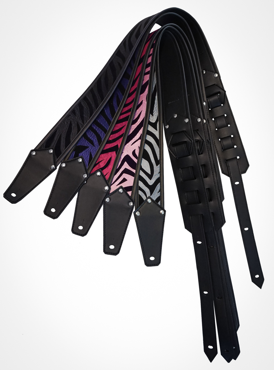 Introducing the ‘Shout At The Devil’ vinyl strap- the most recent addition to our vegan line in 5 new colors. It is made of zebra print flocked taffeta and marine grade vinyl. The look is pure rock ‘n’ roll/punk/rockabilly/metal. This strap sells at a low retail price affordable to new and experienced musicians. We built this style with the same high-quality craftsmanship applied to all our other straps. Guaranteed to last.