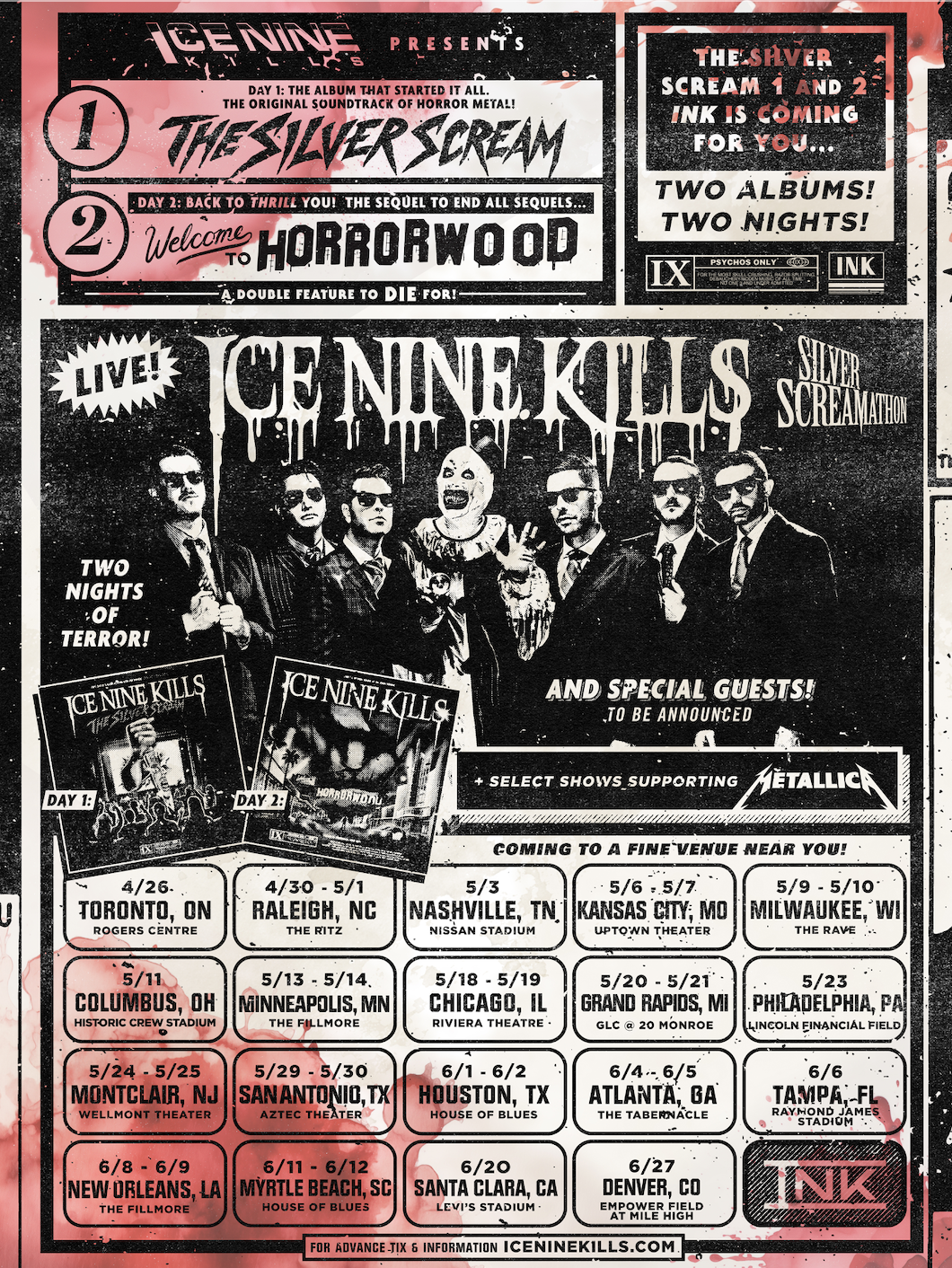 Ice Nine Kills are thrilled to unleash news of their very special US Headline Tour, The Silver Scream-A-Thon. This unprecedented tour, produced by Live Nation, will offer fans a thrilling two-night experience in every city, that will see the band play both their hugely successful, seminal albums The Silver Scream and The Silver Scream 2: Welcome To Horrorwood in full on respective evenings, along with a selection of deep cuts and fan favorites. Tickets for the tour go on general sale at 10am local on Friday, December 20th from IceNineKills.com.