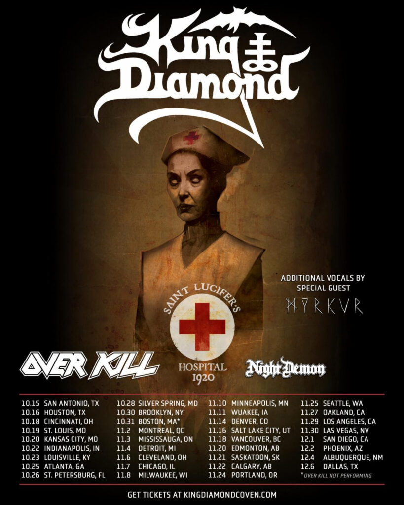 KING DIAMOND will embark on a long-awaited North American headlining tour this Fall! The Saint Lucifer’s Hospital 1920 trek will commence on October 15th in San Antonio, Texas and run through December 6th in Dallas, Texas. Support will be provided by Overkill and Night Demon. Additional backing vocals for the KING DIAMOND set will be provided by special guest, Myrkur.