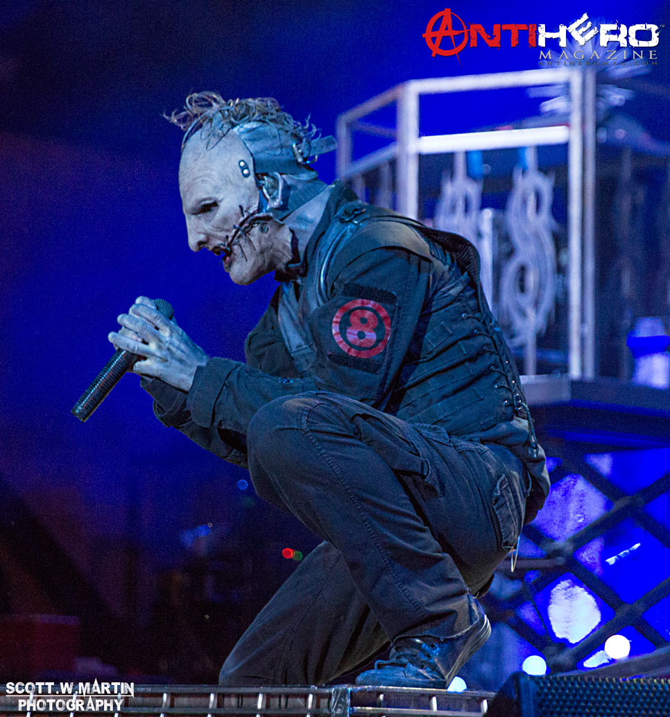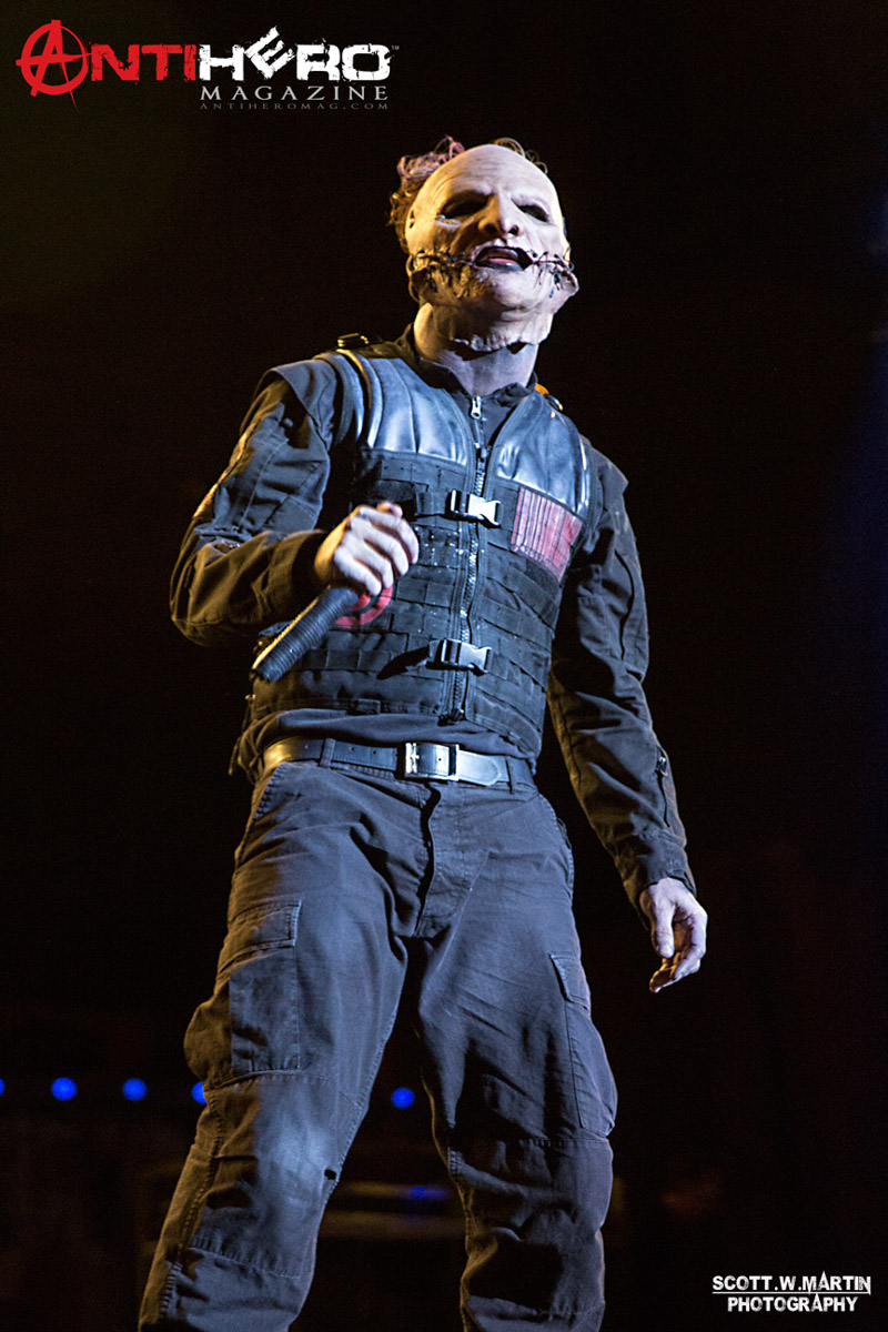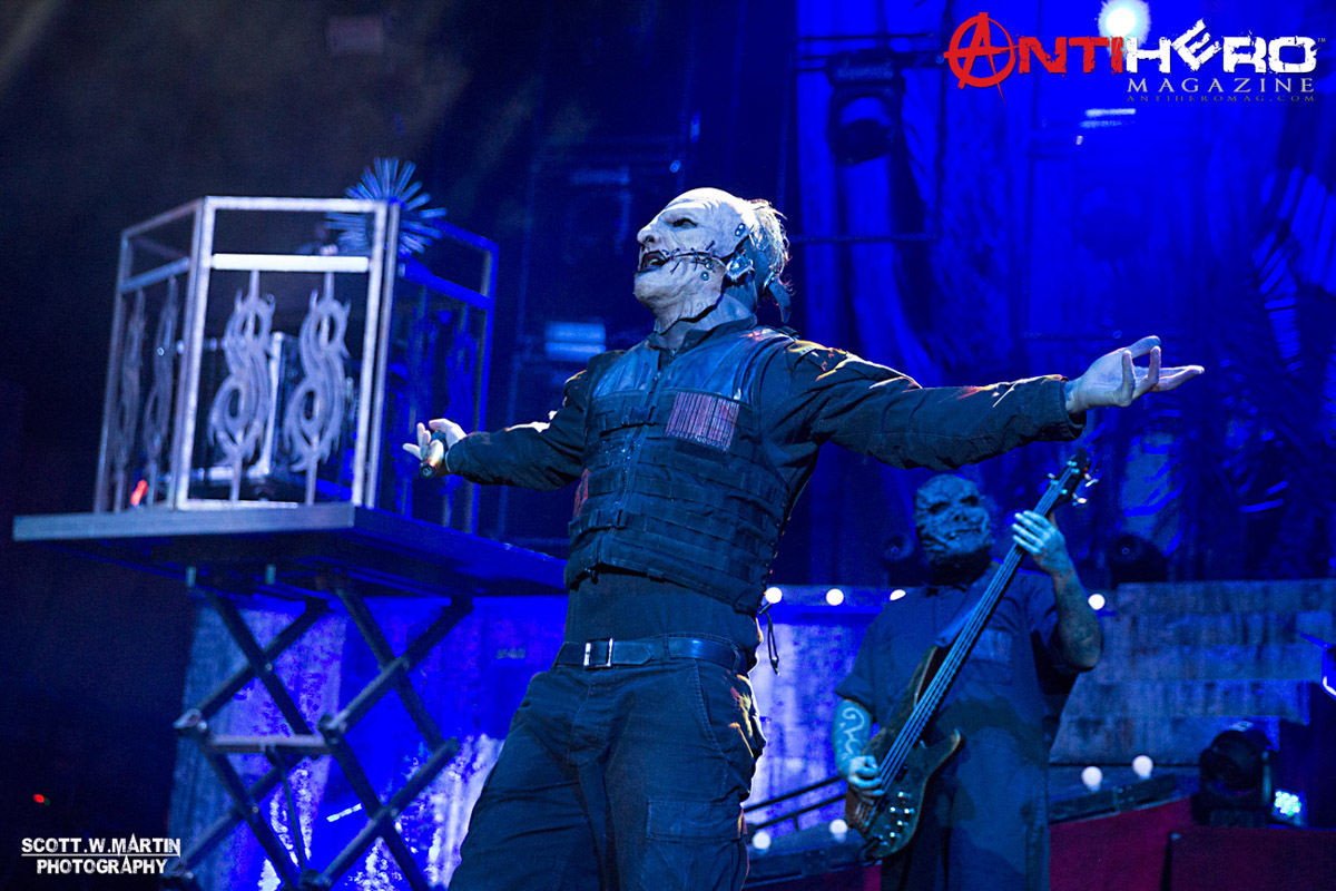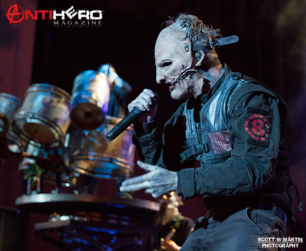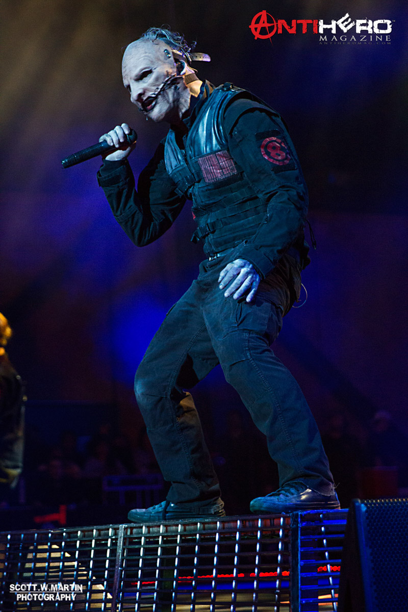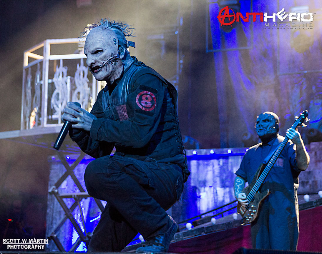 SLIPKNOT – featuring Corey Taylor, Mick Thomson, Jim Root, Craig Jones, Sid Wilson, Shawn Crahan, Chris Fehn, Alessandro Venturella, and Jay Weinberg – performed on Sunday, October 25, 2015 at Knotfest 2015 in San Bernardino, California at the San Manuel Amphitheater. [separator style=”space” /]