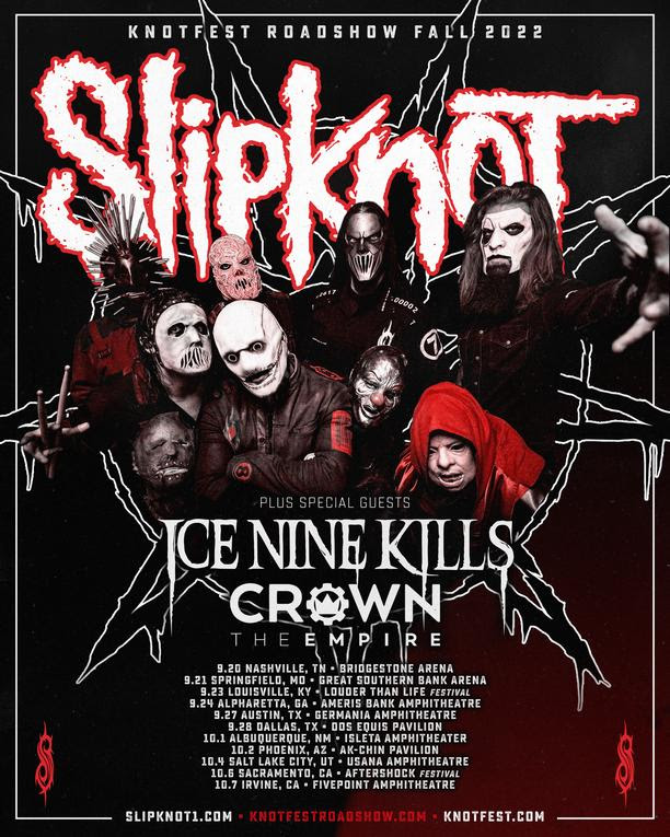 Hot on the heels of the massive second leg of Knotfest Roadshow 2022 tour, Slipknot have announced today that they will be hitting the road for their fall tour, this time with horror-themed metal maestros Ice Nine Kills and metalcore titans, Crown The Empire. Produced by Live Nation, the run will kick off on September 20th in Nashville, TN and hit an additional eight cities before culminating in Irvine, CA on October 7th. Knotfest Presale begins on Tuesday, June 14th for Premium Members and people can sign up to gain access through Thursday, June 16th. General on sale starts at 10am local on Friday, June 17th fromKnotfest.com/Roadshow.