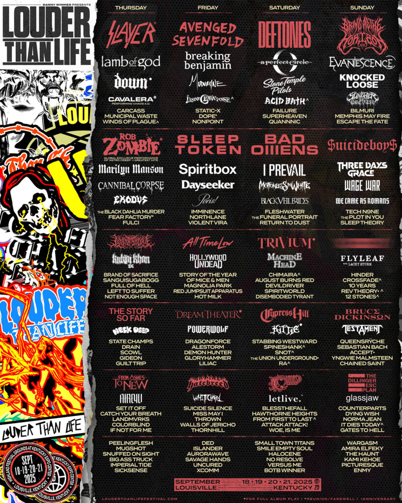 While festival producers Danny Wimmer Presents have unveiled some of the Louder Than Life 2025 bands in recent weeks, the full music lineup–including several reunions and rare performances–is as follows for the 11th year of the fan-favorite event: Slayer, Deftones, Avenged Sevenfold, Bring Me The Horizon, Sleep Token, $uicideboy$, Bad Omens, Rob Zombie, A Perfect Circle, Breaking Benjamin, Marilyn Manson, Evanescence, Knocked Loose, Three Days Grace, Lamb of God, Mudvayne, I Prevail, Spiritbox, All Time Low, Dream Theater, Stone Temple Pilots, Motionless in White, Cypress Hill, Acid Bath, DOWN, Lorna Shore, Bruce Dickinson, The Story So Far, Slaughter To Prevail, Trivium, Chiodos, Hollywood Undead, The Dillinger Escape Plan, Cannibal Corpse, Black Veil Brides, Insane Clown Posse, Dayseeker, Wage War, Powerwolf, Flyleaf w/ Lacey Sturm, Cavalera, Machine Head, Chimaira, Neck Deep, PVRIS, Tech N9ne, Testament, Kublai Khan TX, Story of the Year, Letlive., Glassjaw, State Champs, We Came As Romans, Crossfade, Exodus, DRAIN, From Ashes To New, Static-X, Hatebreed, August Burns Red, Bilmuri, Queensrÿche, Imminence, Atreyu, Carcass, DragonForce, Alestorm, Sebastian Bach, Of Mice & Men, Whitechapel, Suicide Silence, Fleshwater, Superheaven, Kittie, Blessthefall, Rev Theory, Accept, Failure, DevilDriver, Stabbing Westward, Hinder, Counterparts, Yngwie Malmsteen, Municipal Waste, Memphis May Fire, Set It Off, The Black Dahlia Murder, Fear Factory, Scowl, Dope, Violent Vira, Demon Hunter, Spineshank, Hawthorne Heights, From First To Last, The Plot In You, Northlane, Snot, LANDMVRKS, Gloryhammer, Winds of Plague, Brand of Sacrifice, Catch Your Breath, 10 Years, Magnolia Park, The Red Jumpsuit Apparatus, Sleep Theory, Miss May I, Thrown, Escape The Fate, Hot Milk, 12 Stones, Dying Wish, Quannnic, Sanguisugabogg, Nonpoint, Full of Hell, Gideon, Walls of Jericho, The Union Underground, The Funeral Portrait, Attack Attack!, Norma Jean, It Dies Today, Woe, Is Me, Thornhill, Left To Suffer, Aurorawave, Guilt Trip, Spiritworld, RA, Return To Dust, Chained Saint, WARGASM, Amira Elfeky, PeelingFlesh, Ded, Disembodied Tyrant, If Not For Me, Colorblind, Mugshot, Liliac, Savage Hands, Small Town Titans, Smile Empty Soul, Halocene, Versus Me, The Haunt, Kami Kehoe, Picturesque, Snuffed On Sight, Big Ass Truck, Fulci, Not Enough Space, Uncured, Islander, ENMY, No Resolve, Gates To Hell, XCOMM, Sicksense, Imperial Tide, plus the “Loudest in LOU” Contest Winner.