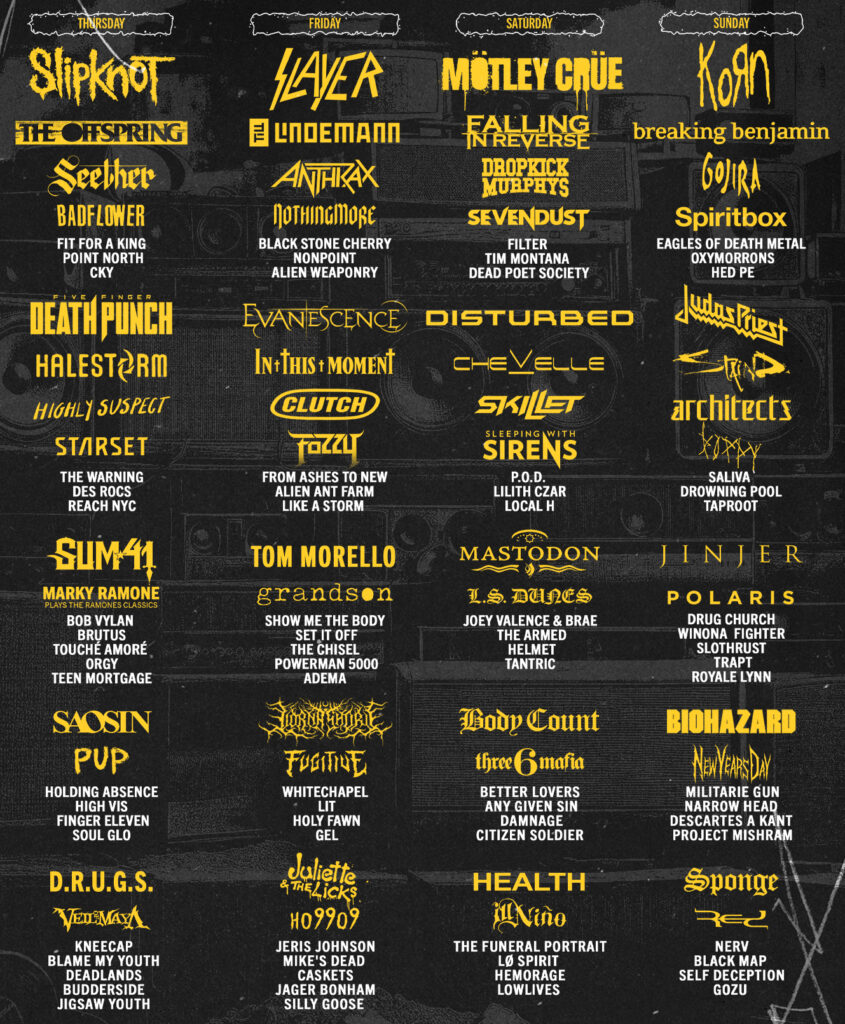 The full music lineup for Louder Than Life 2024 is as follows (subject to change): Slayer, Mötley Crüe, Slipknot, Korn, Disturbed, Judas Priest, Five Finger Death Punch, Evanescence, Falling in Reverse, Breaking Benjamin, The Offspring, Staind, Till Lindemann, In This Moment, Chevelle, Dropkick Murphys, Halestorm, Gojira, Sum 41, Seether, Tom Morello, Anthrax, Mastodon, Architects, Skillet, Clutch, Highly Suspect, Lorna Shore, Body Count, Spiritbox, Grandson, Nothing More, Sevendust, Jinjer, Poppy, Badflower, Starset, Sleeping With Sirens, Filter, Eagles of Death Metal, Juliette Lewis and the Licks, Marky Ramone Plays the Ramones Classics, Black Stone Cherry, PUP, Three 6 Mafia, P.O.D., Fozzy, Fugitive, Saosin, L.S. Dunes, Biohazard, Polaris, From Ashes To New, LIT, Show Me The Body, Joey Valence & Brae, Set It Off, Drug Church, Militarie Gun, The Armed, Narrow Head, Brutus, Bob Vylan, Fit For A King, The Warning, Whitechapel, Better Lovers, New Years Day, Health, GEL, Lilith Czar, Tim Montana, Point North, Holding Absence, Holy Fawn, Drowning Pool, Helmet, Saliva, Alien Ant Farm, Nonpoint, Finger Eleven, Powerman 5000, Local H, ORGY, Taproot, Tantric, Sponge, Trapt, Red, Adema, D.R.U.G.S., Ho99o9, The Chisel, Slothrust, High Vis, Soul Glo, Winona Fighter, Des Rocs, Veil of Maya, Oxymorrons, HED PE, Ill Niño, Damnage, Citizen Soldier, Alien Weaponry, CKY, Dead Poet Society, Kneecap, Teen Mortgage, Touché Amoré, Jeris Johnson, Jager Bonham, The Funeral Portrait, Nerv, Any Given Sin, Like A Storm, Deadlands, Mike’s Dead, Reach NYC, Self Deception, Lø Spirit, Jigsaw Youth, Royale Lynn, Descartes A Kant, Lowlives, Blame My Youth, Caskets, Silly Goose, Gozu, Black Map, Hemorage, Budderside, and Project MishraM.