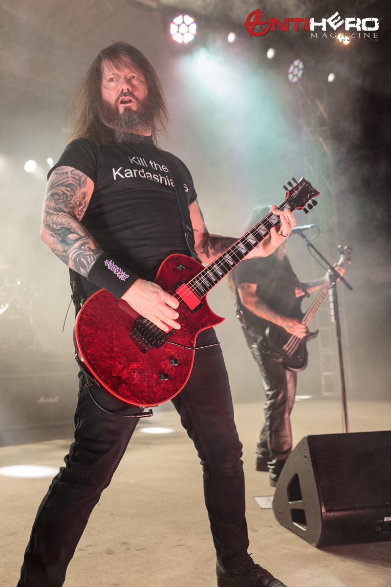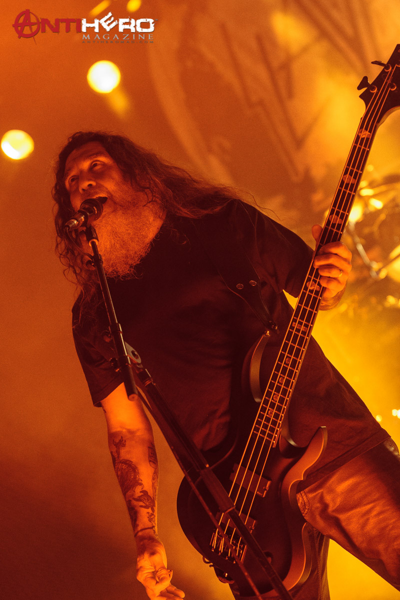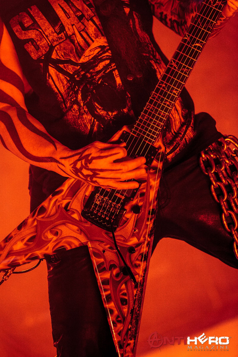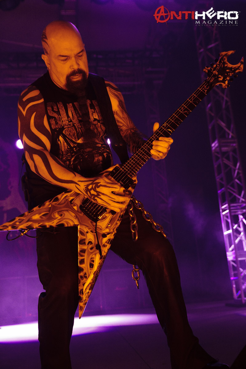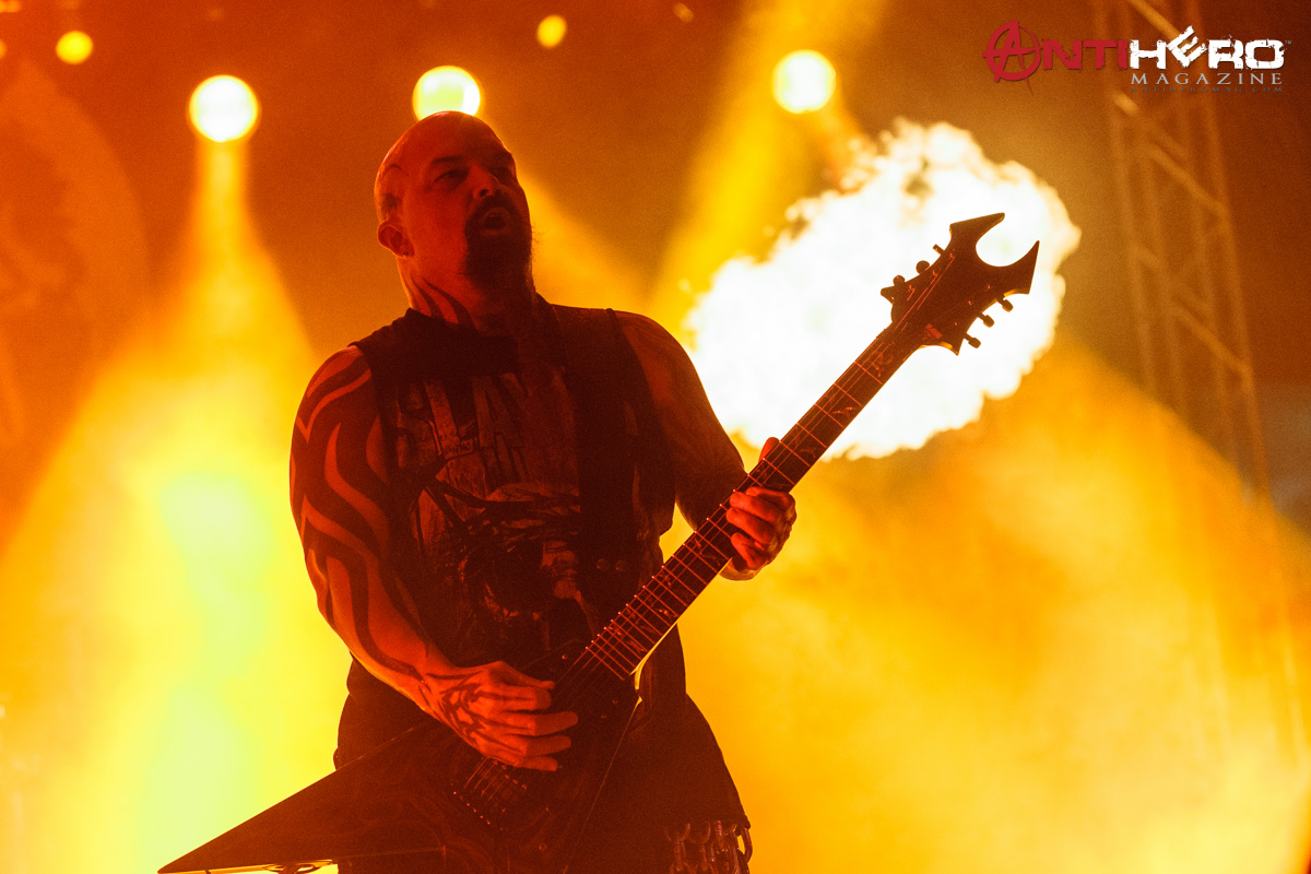 As darkness fell upon the stage, the chants of “Slayer!” began to echo from the crowd that gathered to see one of the “Big Four” that pioneered and shaped the sound of American thrash metal. Slayer bassist and vocalist Tom Araya led an all-out aural assault on the outdoor venue amidst an array of pyrotechnic blasts, flanked on either side by guitarists Kerry King and Gary Holt, and drummer Paul Bostaph laying down the rapid fire, breakneck tempo from the back of the stage. Playing an extended set of crowd favorites, the band ripped through several classic Slayer tunes such as “War Ensemble,” “Mandatory Suicide,” “Dead Skin Mask,” and “South of Heaven,” before ending the evening with the infamous “Angel of Death.”