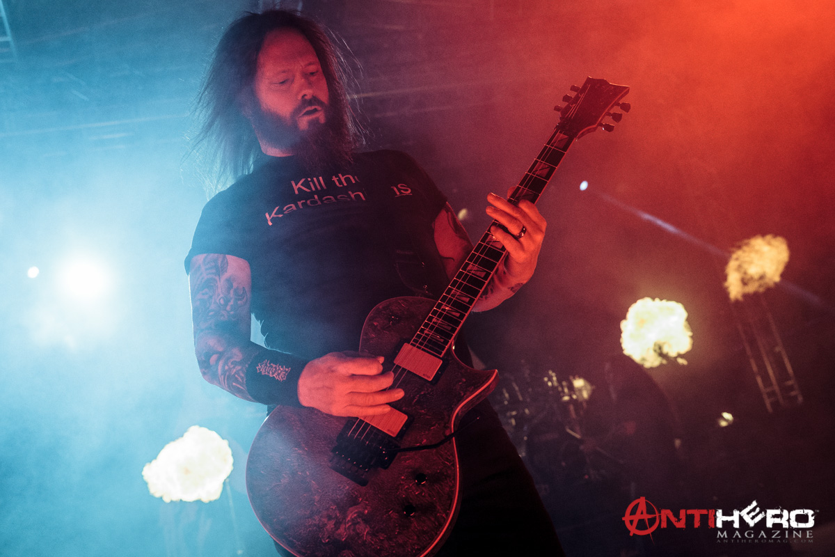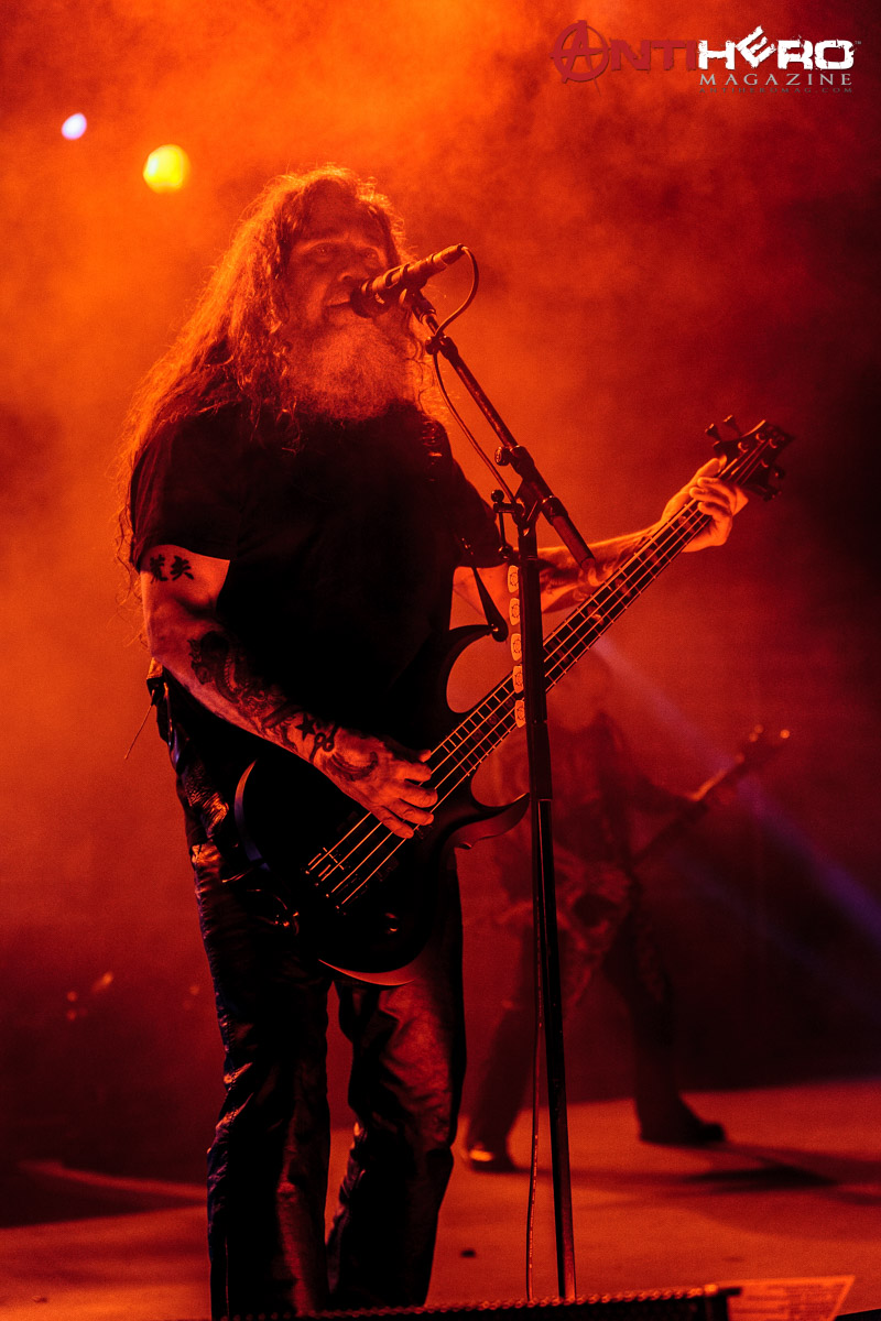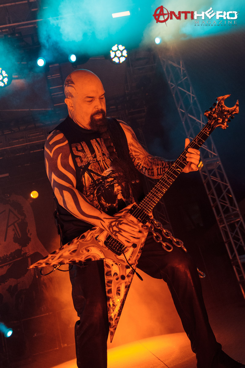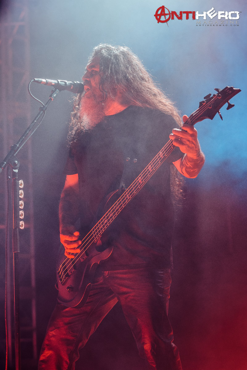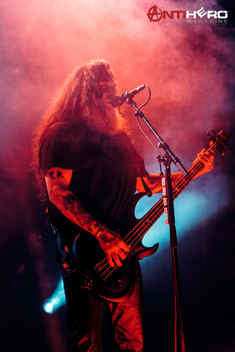 As darkness fell upon the stage, the chants of “Slayer!” began to echo from the crowd that gathered to see one of the “Big Four” that pioneered and shaped the sound of American thrash metal. Slayer bassist and vocalist Tom Araya led an all-out aural assault on the outdoor venue amidst an array of pyrotechnic blasts, flanked on either side by guitarists Kerry King and Gary Holt, and drummer Paul Bostaph laying down the rapid fire, breakneck tempo from the back of the stage. Playing an extended set of crowd favorites, the band ripped through several classic Slayer tunes such as “War Ensemble,” “Mandatory Suicide,” “Dead Skin Mask,” and “South of Heaven,” before ending the evening with the infamous “Angel of Death.”