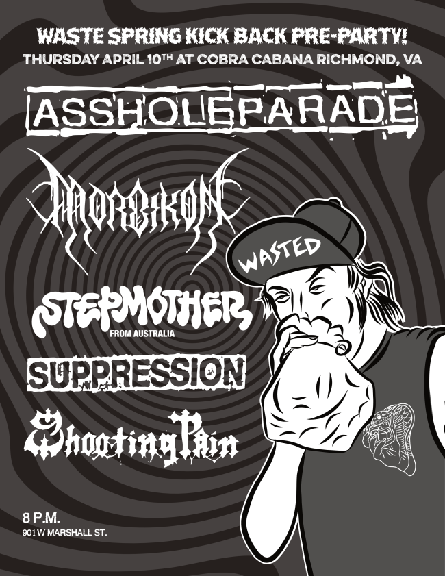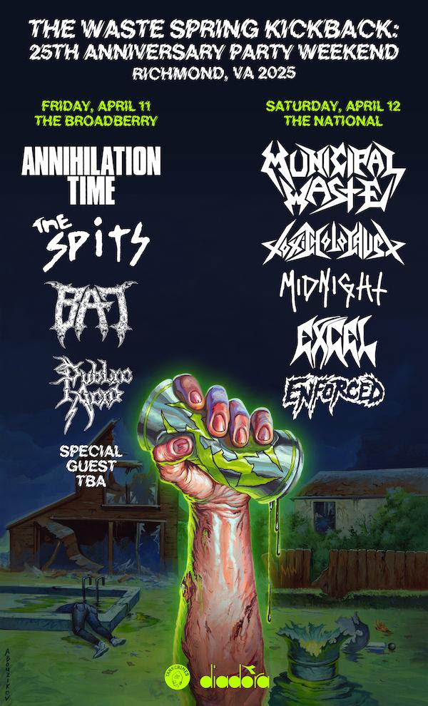 If there’s one band who knows how to throw a rager, it’s Richmond thrash kings, MUNICIPAL WASTE! The band is now inviting fans to kickoff their previously announced 25th anniversary ‘Spring Kickback’ weekend with a raucous pre-party! The ‘Waste Kickoff’ show will take place on April 10, 2025 @ Cobra Cabana in Richmond, VA and features performances by Asshole Parade, Morbikon, Stepmother, Suppression, and Shooting Pain.