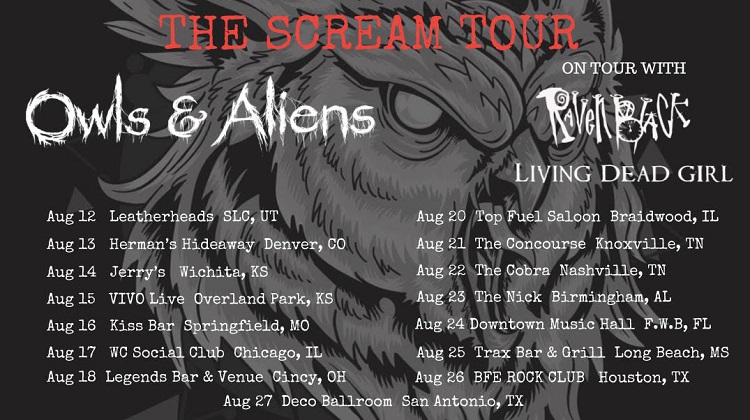 Oregon based Hard Rock band OWLS & ALIENS has announced that they will be joining Cinematic Rock band RAVEN BLACK and LIVING DEAD GIRL on the THE SCREAM TOUR! Launching August 12 at Leatherheads in Salt Lake City, UT the tour winds though the South and Central United States, wrapping up August 25 at the BFE Rock Club.