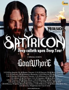 In support of their latest opus “Deep calleth upon Deep,” SATYRICON have returned to U.S. shores for the final time.  The tour kicked off last night in Los Angeles and stops tonight in Oakland, CA.  The tour runs through May 30th in Austin, TX with two stops in Canada.  Goatwhore will provide support on the tour.  A complete list of dates can be found below.   The run also includes a headline appearance at The Maryland Death Fest.