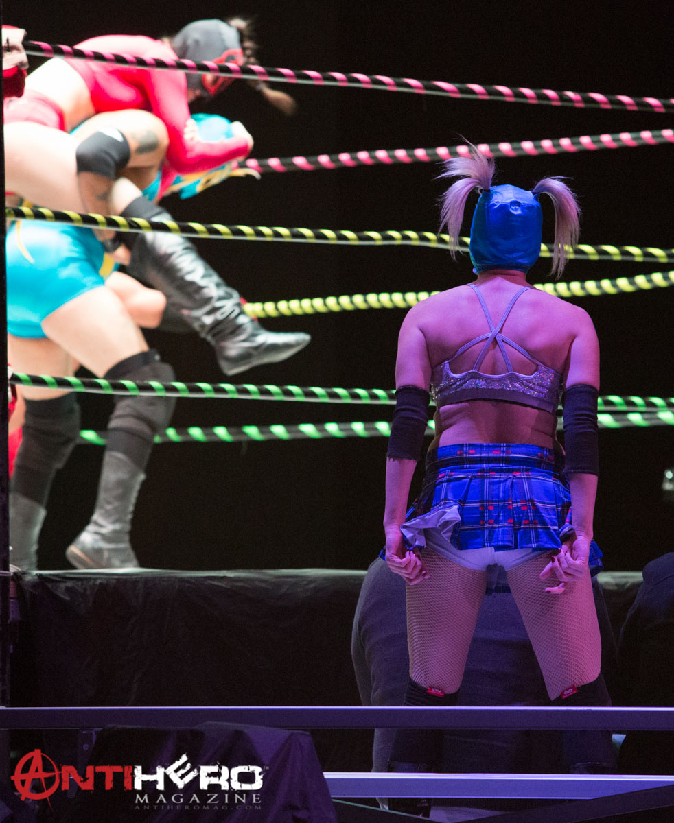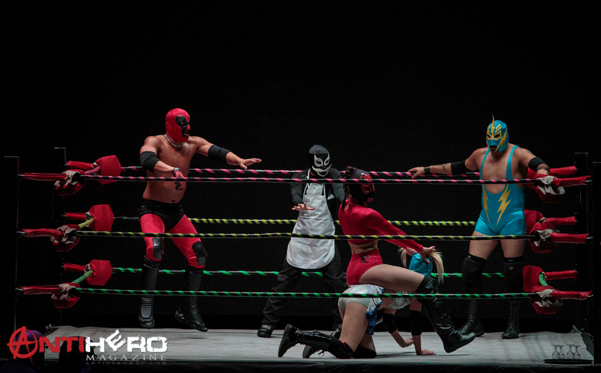 Up next was the MAIN EVENT – sorry, I just had to do that! As the lights came up, you could see the band waiting to get into their set. A very light mesh curtain that really left nothing to the imagination lifted and the band tore into their first song “Simulataneous.” Now, I am going to be honest with you guys here, this was my first time ever hearing anything by Puscifer, and I have to say that I rather enjoyed the experience. Again, I’m not going to lie – I’m not sure if the music is something I would throw on in the car and jam out to, but the live experience was fantastic. From the ever-melodic vocals of Maynard James Keenan, to the siren songs of Carina Round, it was a spectacle that I feel you should take in, given the chance. Oh, and don’t even think that the wrestling action ended. Not only were there brief intermissions where matches would take place, but even during certain songs a fight would break out.