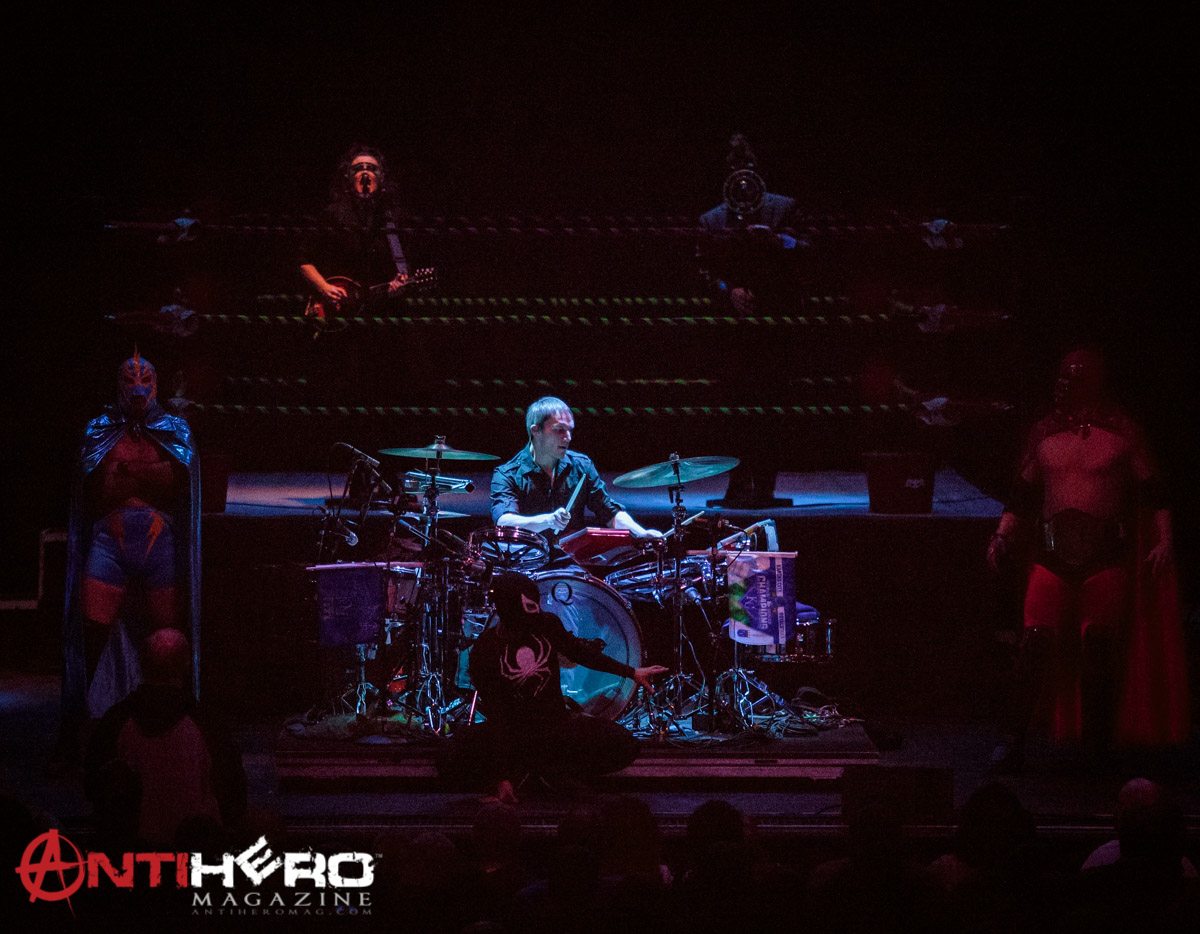 I have to say the thing that stuck out the most to me was the sound. I have never been to a show – and I have seen a few – that had the sound quality of the Puscifer show. I don’t know if The Midland was in charge of the sound, or if the band’s crew handled it themselves, but people should have been taking notes. The vocals were crisp and could be heard over the sounds of the drums and guitars. The bass guitar was not an afterthought and could be heard right up front with everything else. I also liked how with the wrestling ring staying on the stage the drummer was up front and center, and is a very intricate piece in their music. When you go to see Puscifer, you are not going to see a concert, you’re going to see a show. I can only liken it to the closest thing we will get to seeing a Pink Floyd show in our modern era. I have said this before, shows like this are why I love what I do. On my own, I would have never gone to see Puscifer, and I would have missed out on an incredible evening.