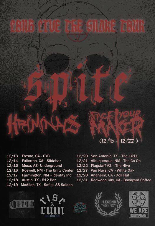 SPITE has also announced the dates of their upcoming U.S. “Long Live The Snake Tour” with Face Your Maker & Kriminals. The tour kicks off on December 13th in Fresno, California and works it way to the Midwest and back wrapping up on December 31st in Redwood City, California.