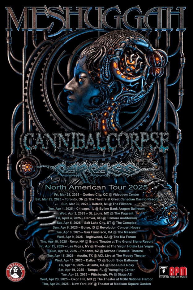 Get ready for one of the most highly anticipated tours of 2025! Swedish metal juggernauts MESHUGGAH will make their triumphant return to North American stages, bringing their genre-defying, mind-bending sound to fans across the U.S. and Canada. Joining them on this monumental trek, produced by Live Nation, are the fellow legendary acts Cannibal Corpse and Carcass, making this THE tour of the year for metal fans.