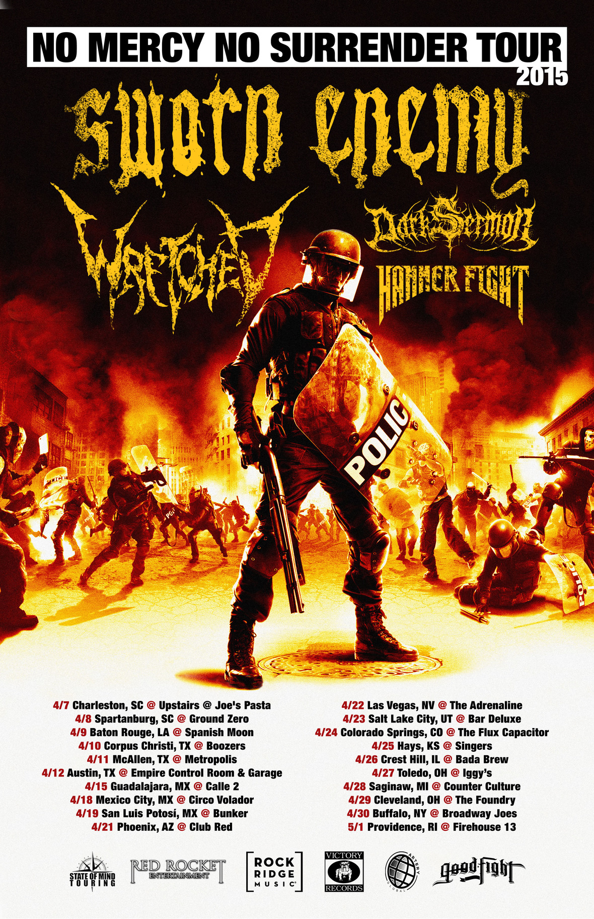 New York Hardcore legends Sworn Enemy have announced the dates of the No Mercy No Surrender Tour 2015. Wretched (Victory Records), Dark Sermon (Goodfight Music), and Hammer Fight will be joining them on the tour, kicking off April 7th in Charleston, South Carolina and working it’s way throughout the U.S. and wrapping up on May 1st in Providence, Rhode Island. Sworn Enemy will be touring in support of their latest record Living on Borrowed Time (Rock Ridge Music/ADA) which landed on two of Billboard’s top charts including #8 on The Heatseekers Chart and #20 on the Hard Music Chart.