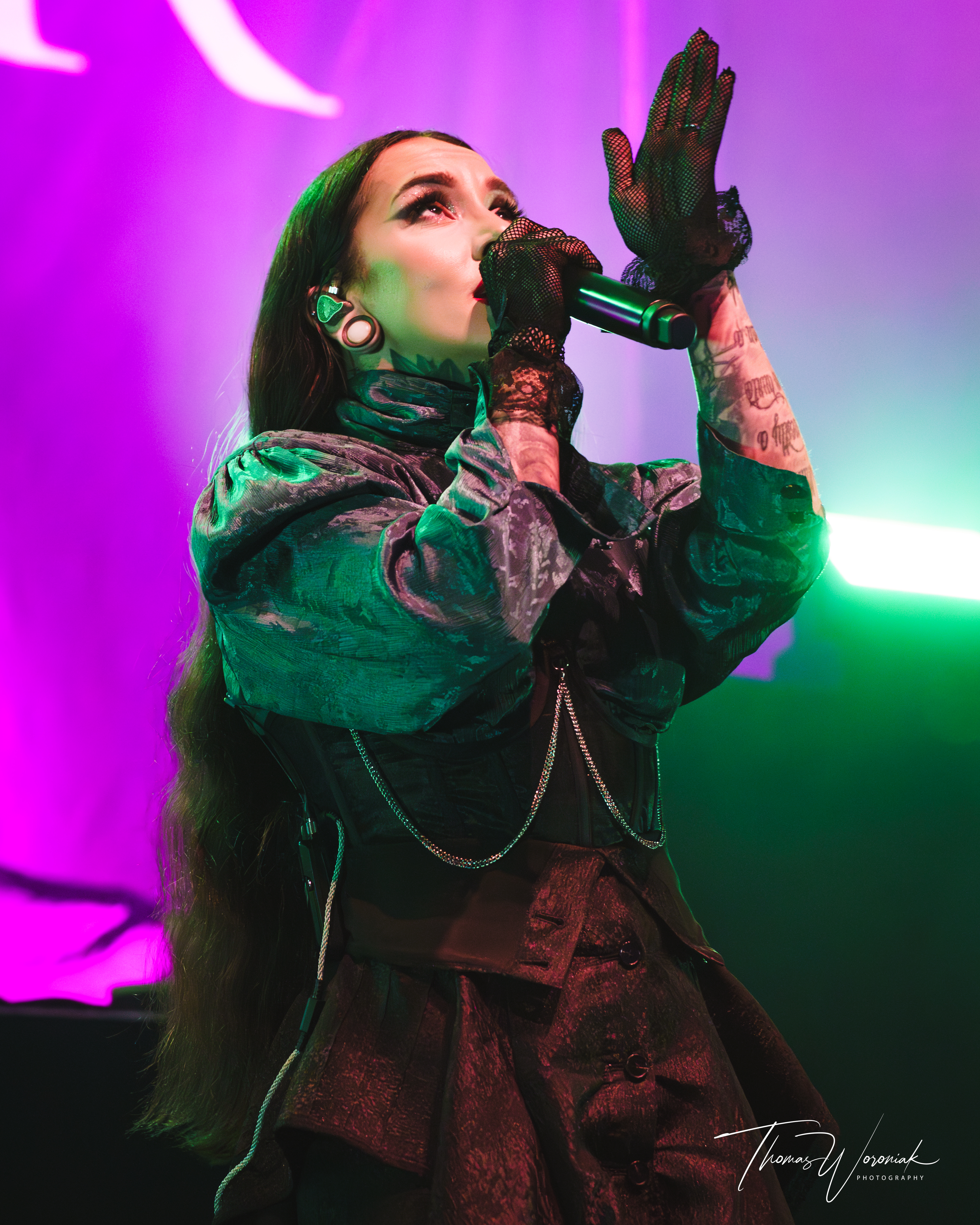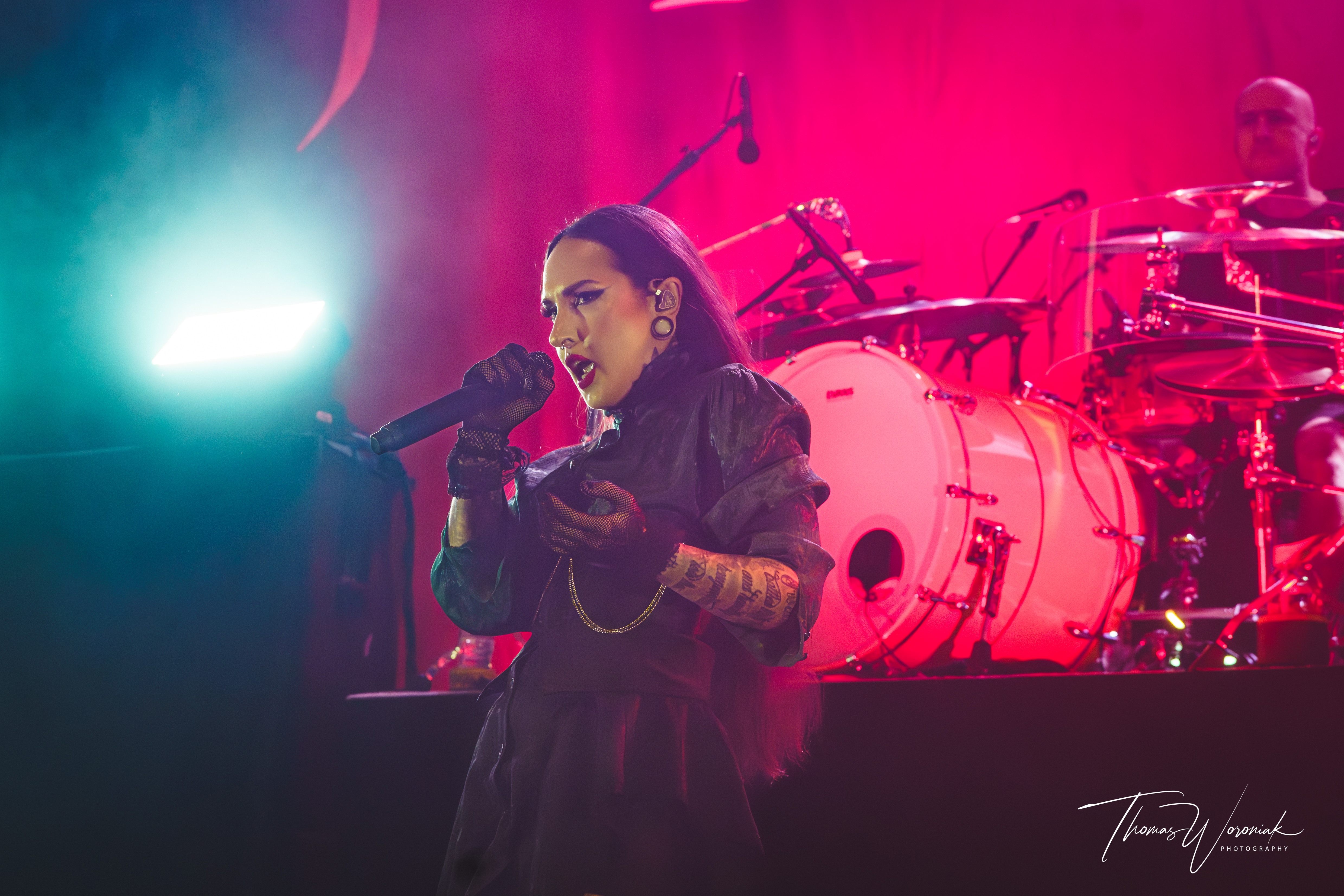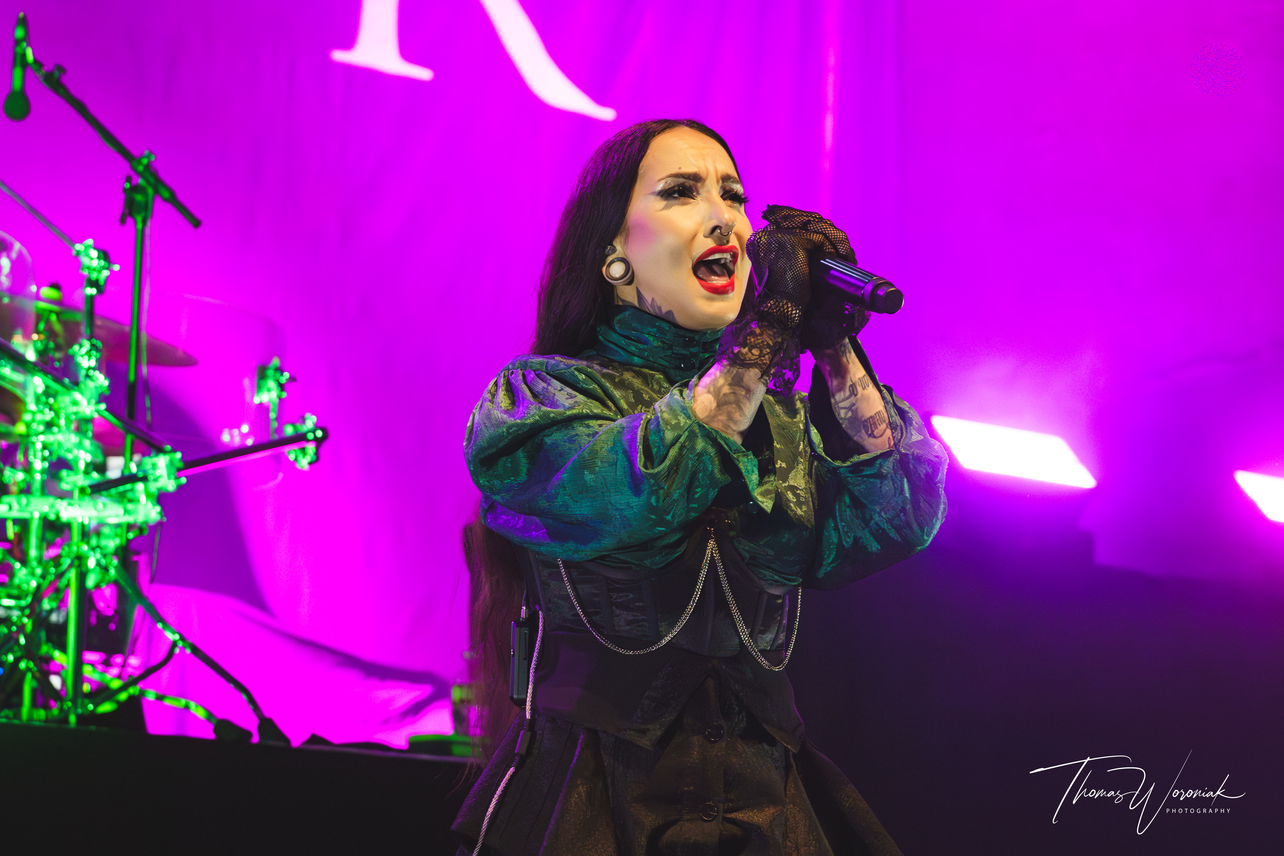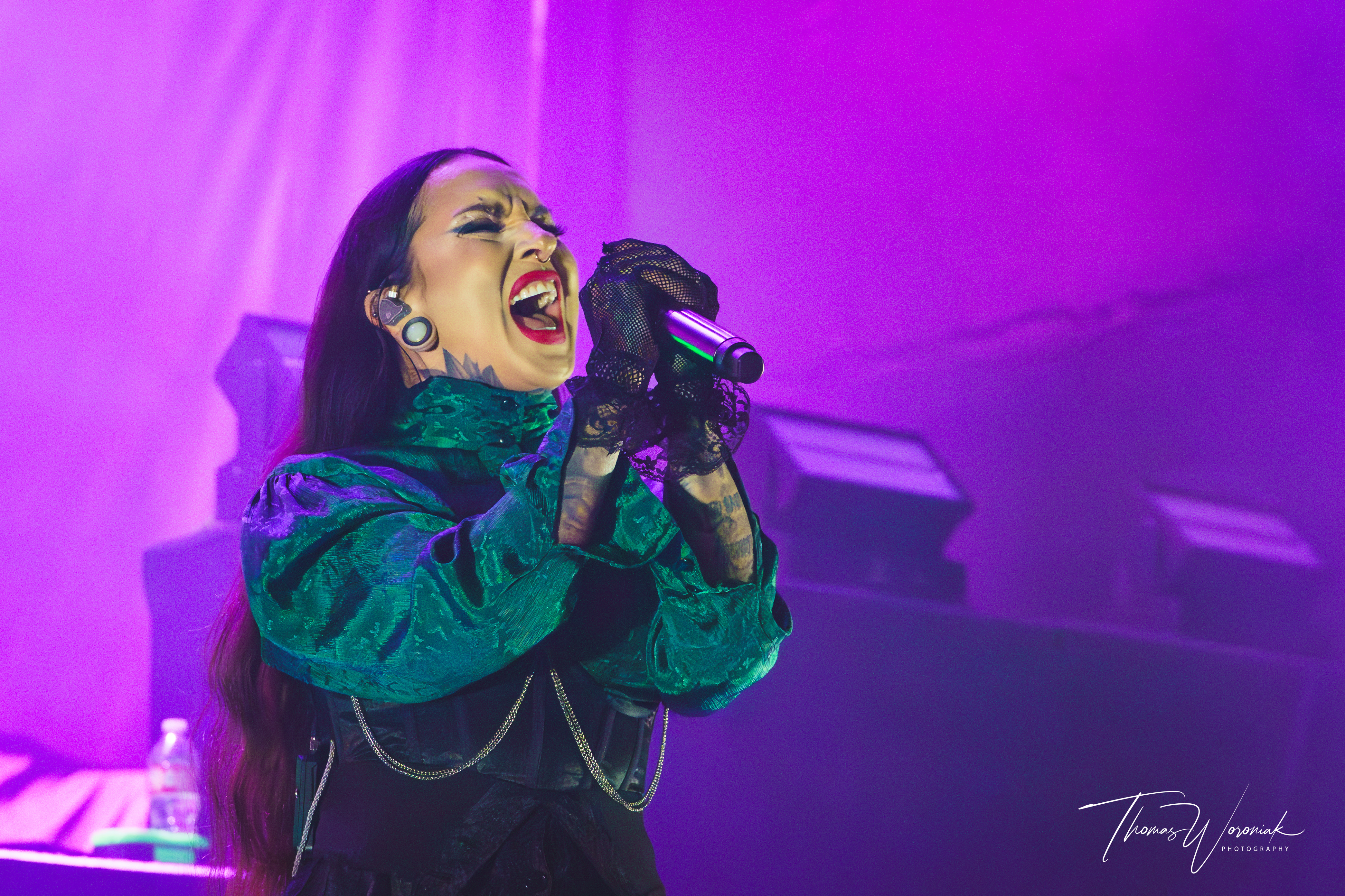 That tension exploded into motion with Jinjer, whose reputation as one of metal’s most commanding live acts remains well-earned. Opening with “Duél” and “Green Serpent,” the band immediately demonstrated their effortless command of groove, technicality, and rhythmic complexity. Tatiana Shmayluk’s vocal performance was the undeniable centerpiece—shifting seamlessly from brutal lows to melodic clarity without losing intensity.