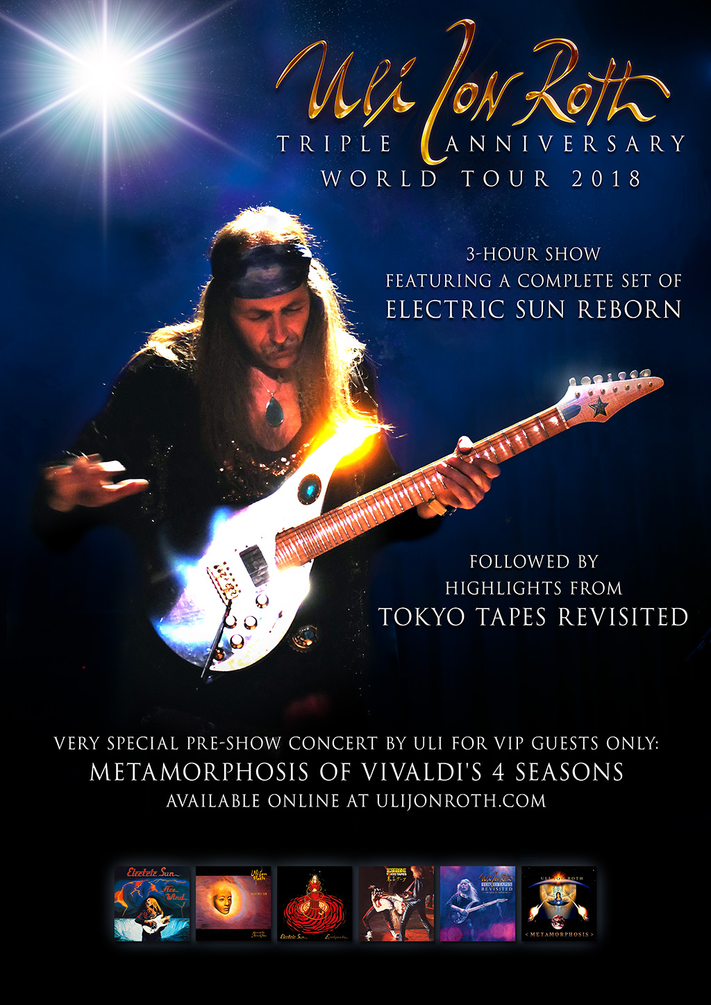 His two-month TRIPLE ANNIVERSARY NORTH AMERICAN TOUR – starting at the end of May 2018 – will be devoted to performing a complete set of Songs from Uli’s ground breaking ELECTRIC SUN period.