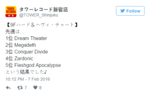 According to a tweet by Tower Records Japan, the Top 5 Hard & Heavy Charters include progressive metal veterans Dream Theater, thrash metal legends Megadeth, heavy hitting all-female newcomers Conquer Divide, Venezuelan electronic music juggernaut Zardonic and Italian neoclassical death metallers Fleshgod Apocalypse.